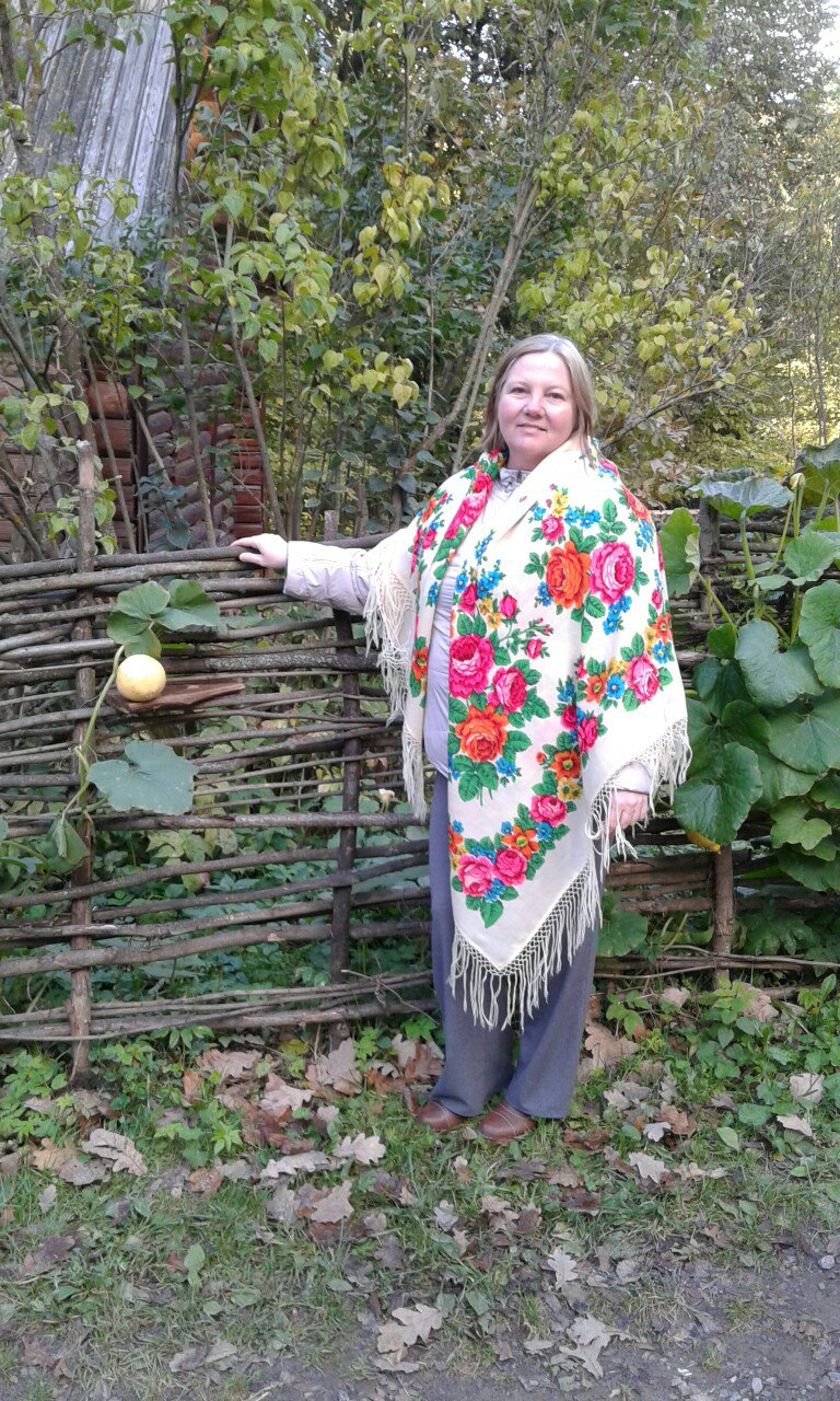 Наш любимый продавец с нами, она в оранжевом Разводном... мы показываем и новинки и старинки и разные колориты платочков