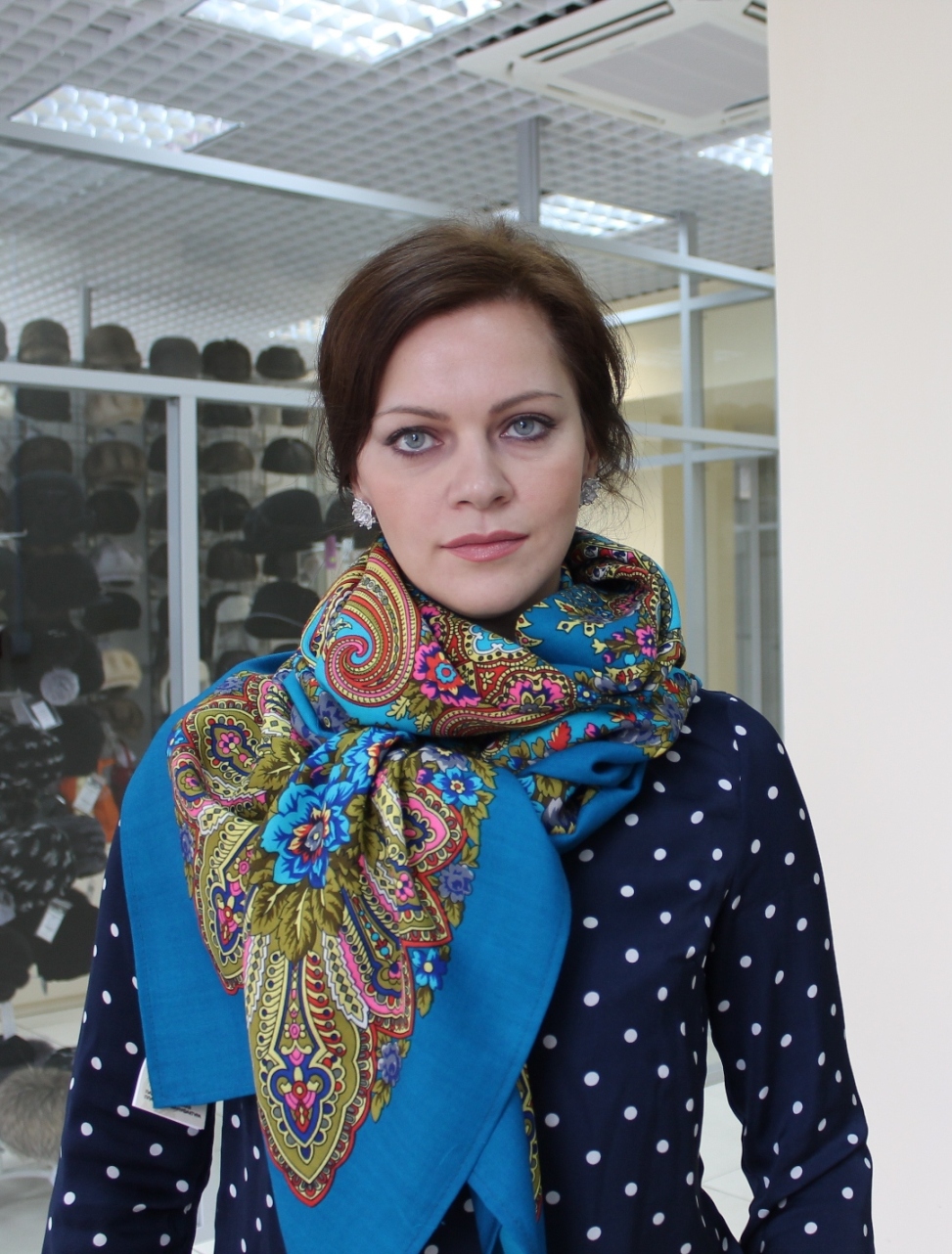 Оля в первый раз увидела Разводной бирюзовый и совершенно подпала под его чары. Платок, мне кажется, отвечает ей взаимностью.