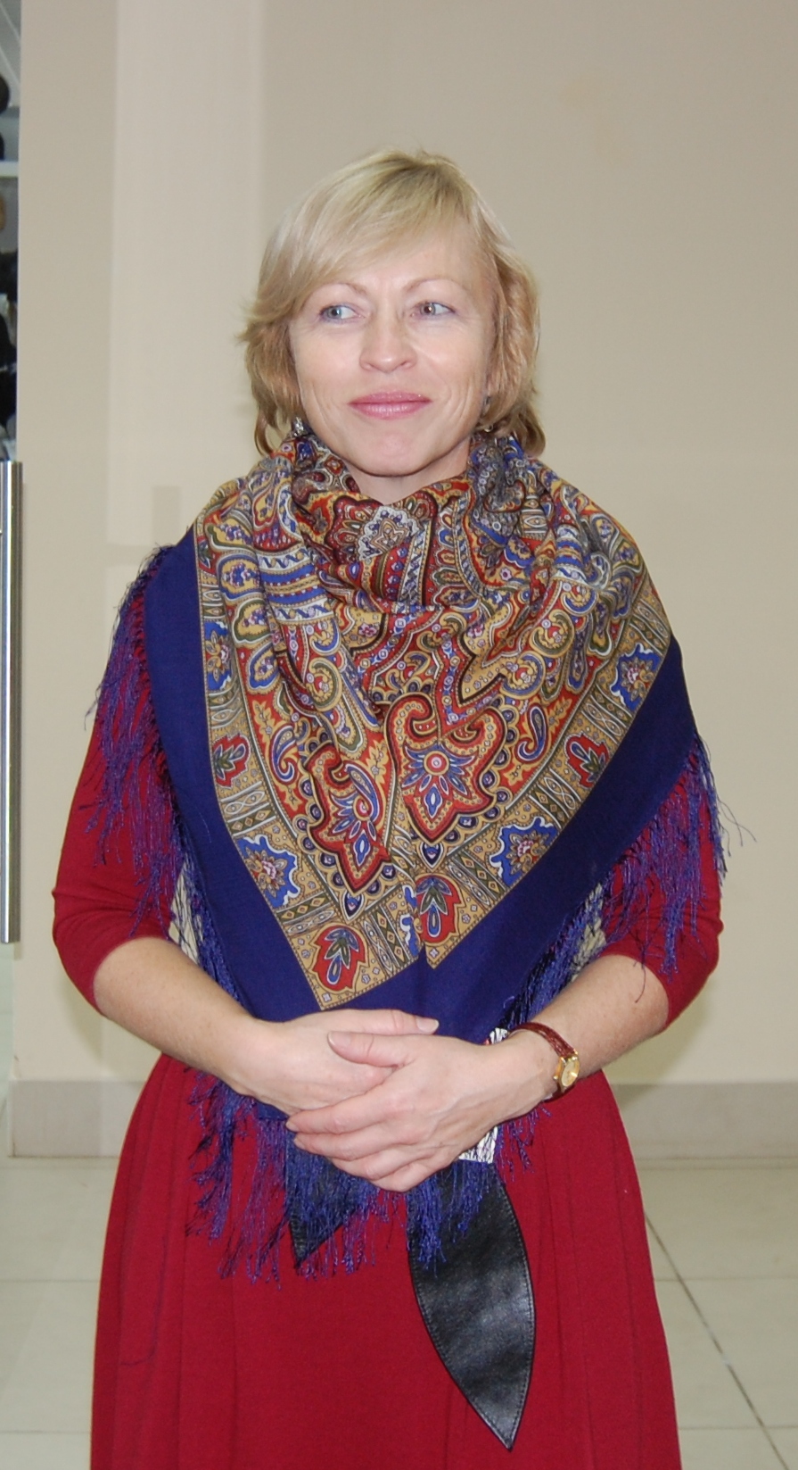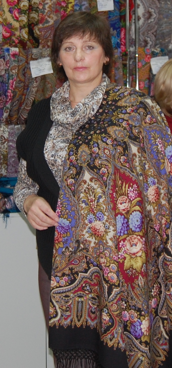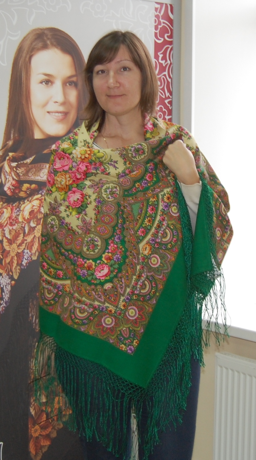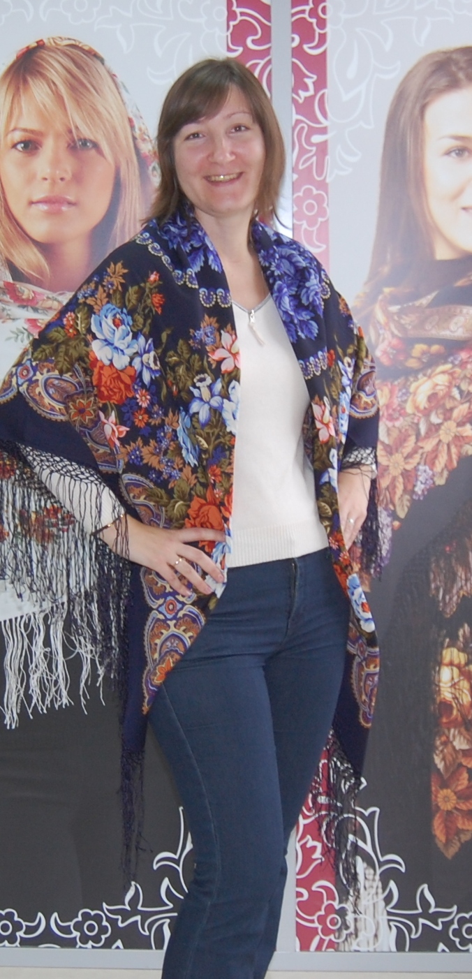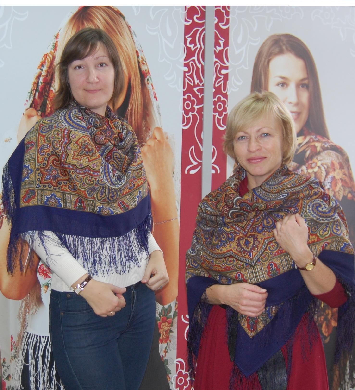 На Оле прекрасен любой платок, на Марине особенно понравились палантин Расцветающие камни - 60, платочки : Восточный калейдоскоп и Волшебный танец, синее с розовым сочетание. В Классический -14 я влюбилась, он замечательный и подходит всем, так же как и Испанский -14.