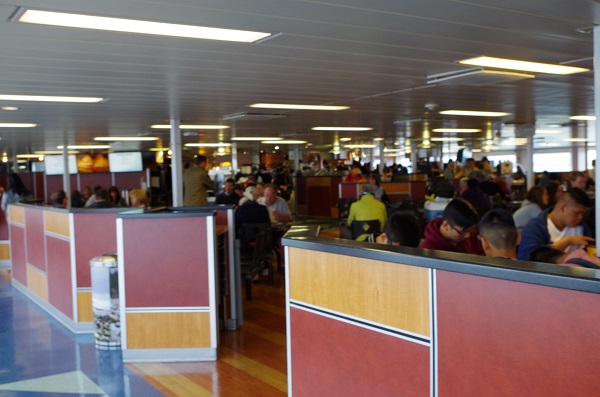Потом пошли бродить по парому. Лет 10 назад, помню на паромах были рестораны, с хорошей кухней, шведским столом и замечательным обзором. Поэтому прожужжав все уши Просветику, что завтракать будем в обалденном месте - пошли искать ресторан. Но кроме, столовки, в которую ломанулись все пассажиры парома - ни чего больше не нашли. Итак, типичный канадский фудкорт, но уже на пароме... Завтрак, как сказала Просветик был хорошим, надо отдать им должное.