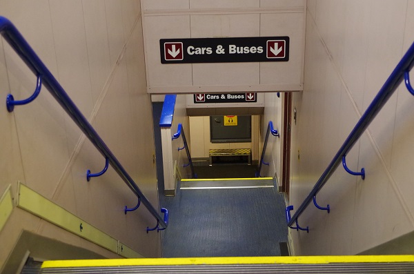 Долго бродить по парому нам не пришлось. Дождавшись пока основная часть пассажиров ломанувшихся в столовку - поест, пошли то же завтракать. Хорошо, хоть очередь не надо было уже стоять. Только закончили завтрак, и решили пойти бродить по парому дальше - услышали просьбу всем вернуться в машины. Подплываем к острову. По пути успели забежать на нижние палубы и впечатлиться мощью парома. Там и автобусы и большие фуры! Сфотографировать успели только лестницу на палубы.