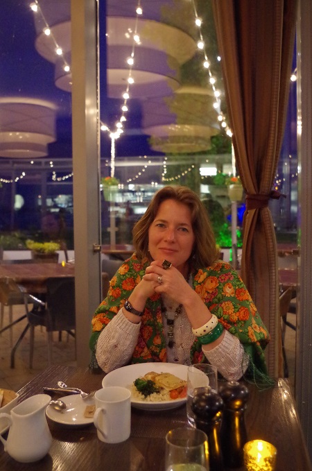 Я то себе быстро выбрала вторую зеленую шаль - русский сувенир, как раз под новую сумку. А Просветик надела чудное платье в розочках - прямо как на наших любимых платочках. Смотрели, мы смотрели на него, и не могли вспомнить, что же из 2 сундуков выбрать? Пошли к машине и эмперическим путем, открыв сундучки и переворошив шальки - нашли чудный платочек Цветочная сказка, идеально сочетающийся с ее нарядом. Ресторанчик находился прямо на берегу океана. как все порядочные туристы запечатлели себя на память об этом вечере на фоне тарелок. ну а потом пошли гулять уже по темноте