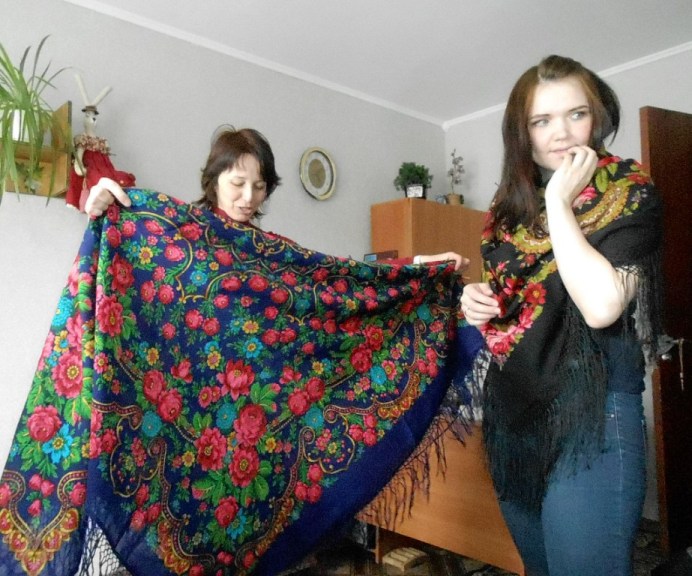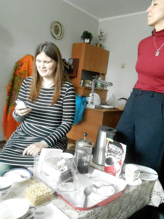 Девочки принесли конфеты, пирожные, так что у нас получилось отменное чаепитие. Все, кроме Маши без сил сели попить чайку, а Маша продолжала мерить шали. ну просто энерджайзер.