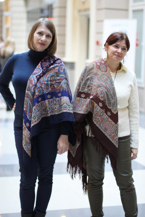 А мне кажется, что очень удачно наши две девушки выбрали себе колориты для примерки и фото. Каждой очень идёт именно та шаль, что на ней в данный момент, а они такие разные!