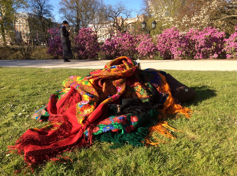 Фото шалек на заветных скамеечках в этот раз не будет, скамеечки все были заняты обалдевшими от яркого солнечного дня рижанами и гостями города. Поэтому мы вольготно расположились на лужайке у Оперного театра.