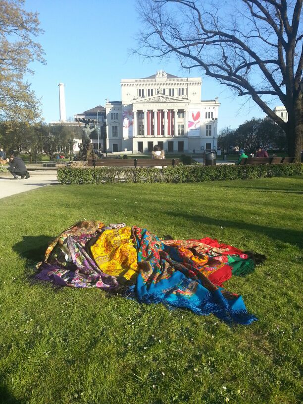 В Риге на этот раз решили поснимать платки на лужайке перед оперным театром.