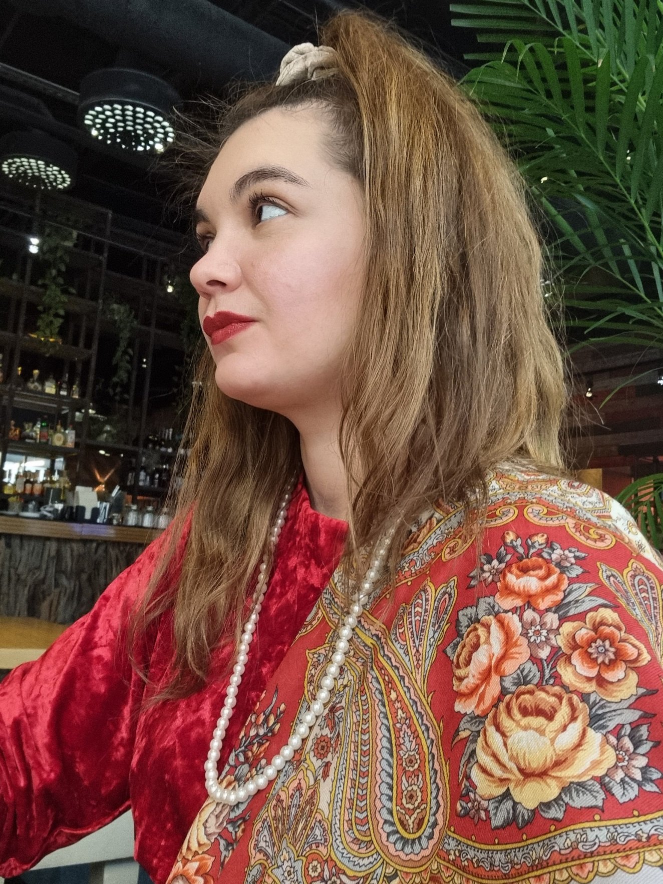 Взяла Рябину 7а на посмотреть, ага, сразу сняла этикетку и пошла гулять. На улице фото не получились вчера, ветер, нос красный, так что пока только в помещении у окна. Очень мне понравился этот колорит. У меня был просто 7, не носился, но любовалась. Для меня он отсылка к бабушке, к старинке, а этот очень современный городской платок. Ещё фото с сравнения добавлю.