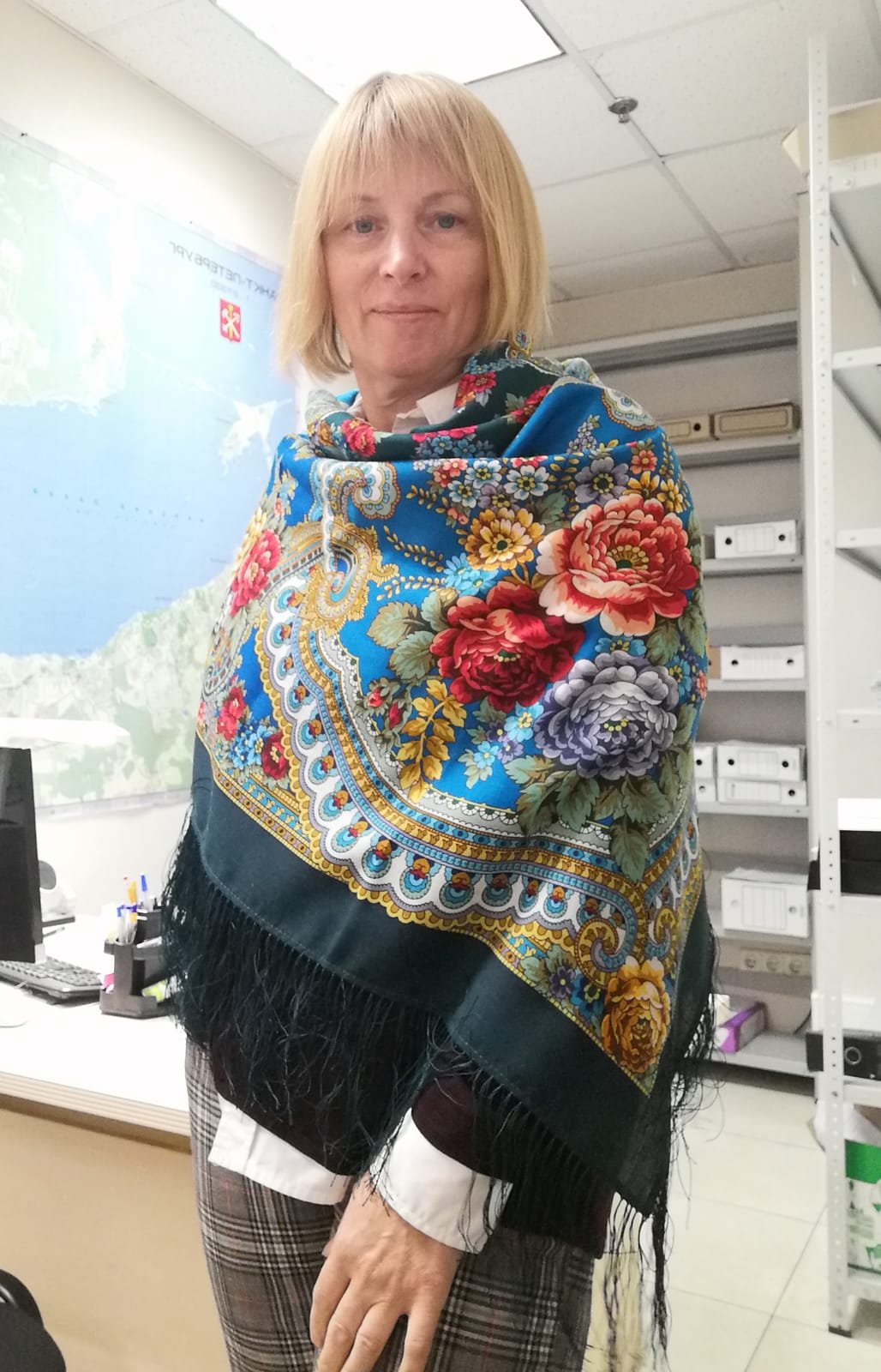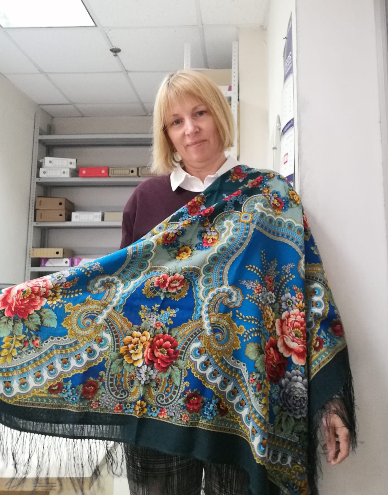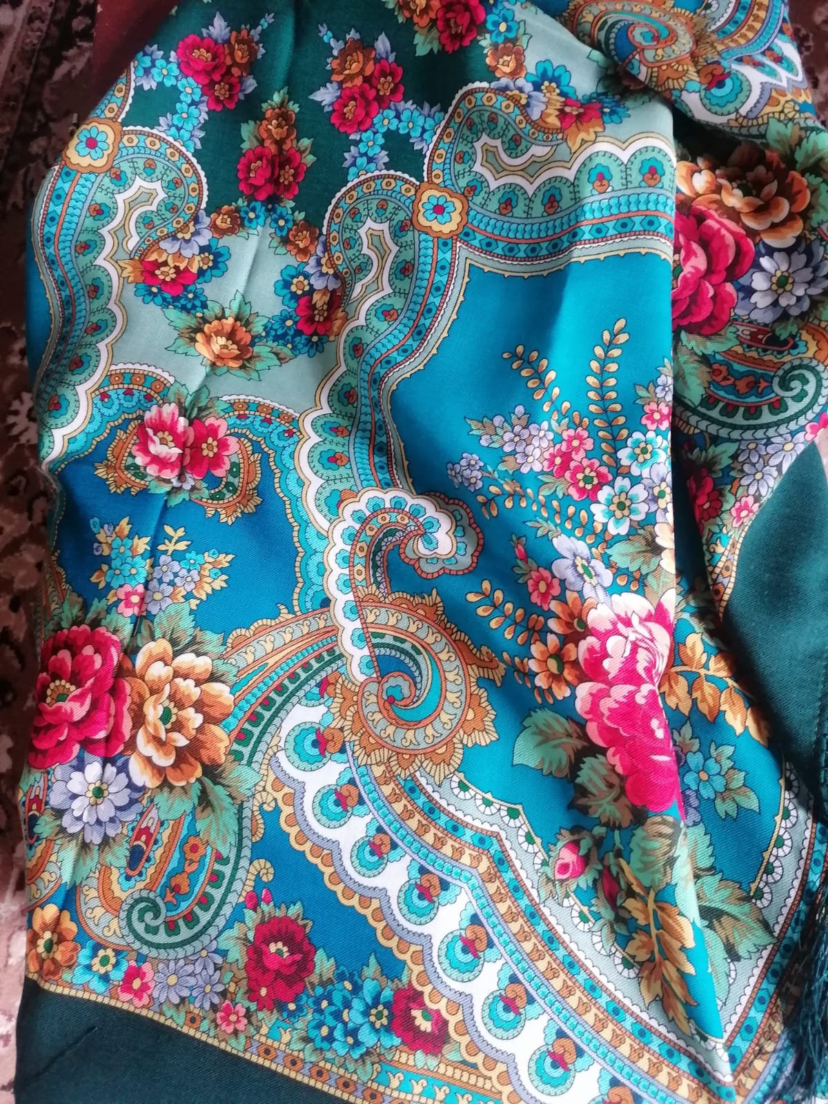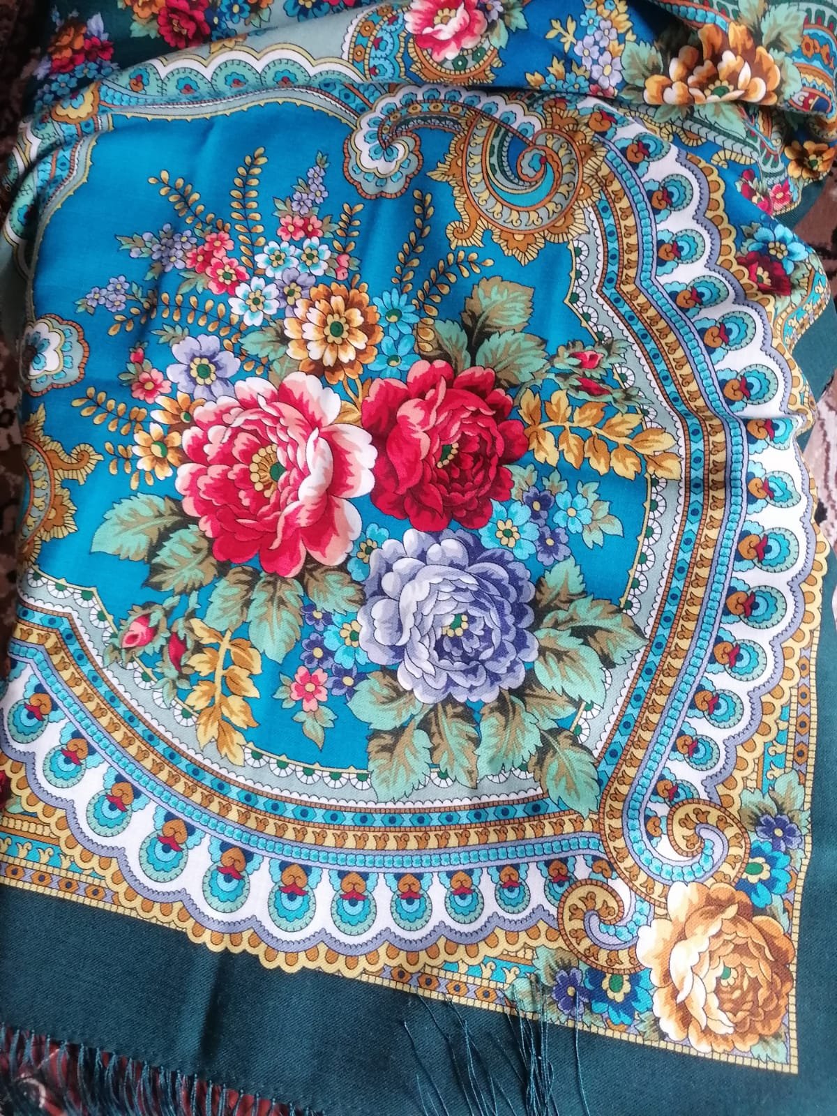 Добавлю еще бирюзы! Кто не хотел Петрушку? Это я! Платочек замечательный, но я и сейчас еще в сомнениях! Первые впечатления пожалуй самые верные ! Слишком веселый , сказала я подруге, мне бы что-нибудь задумчивое, осень наверное навевает такие настроения! Но показать - покажу, правда на работе, дождь у нас и облачно! Кайма кстати почти ровная, от 5 до 5,5 см.