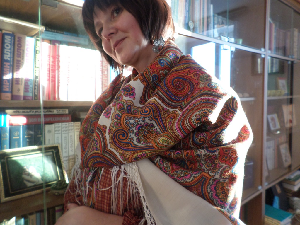И полюбившая быть моделью (надеюсь от души:)) Юля. Старается показать платок для нас! Очень она отметила необычность платка "Шолпан". И как он ее украсил, вы согласны?