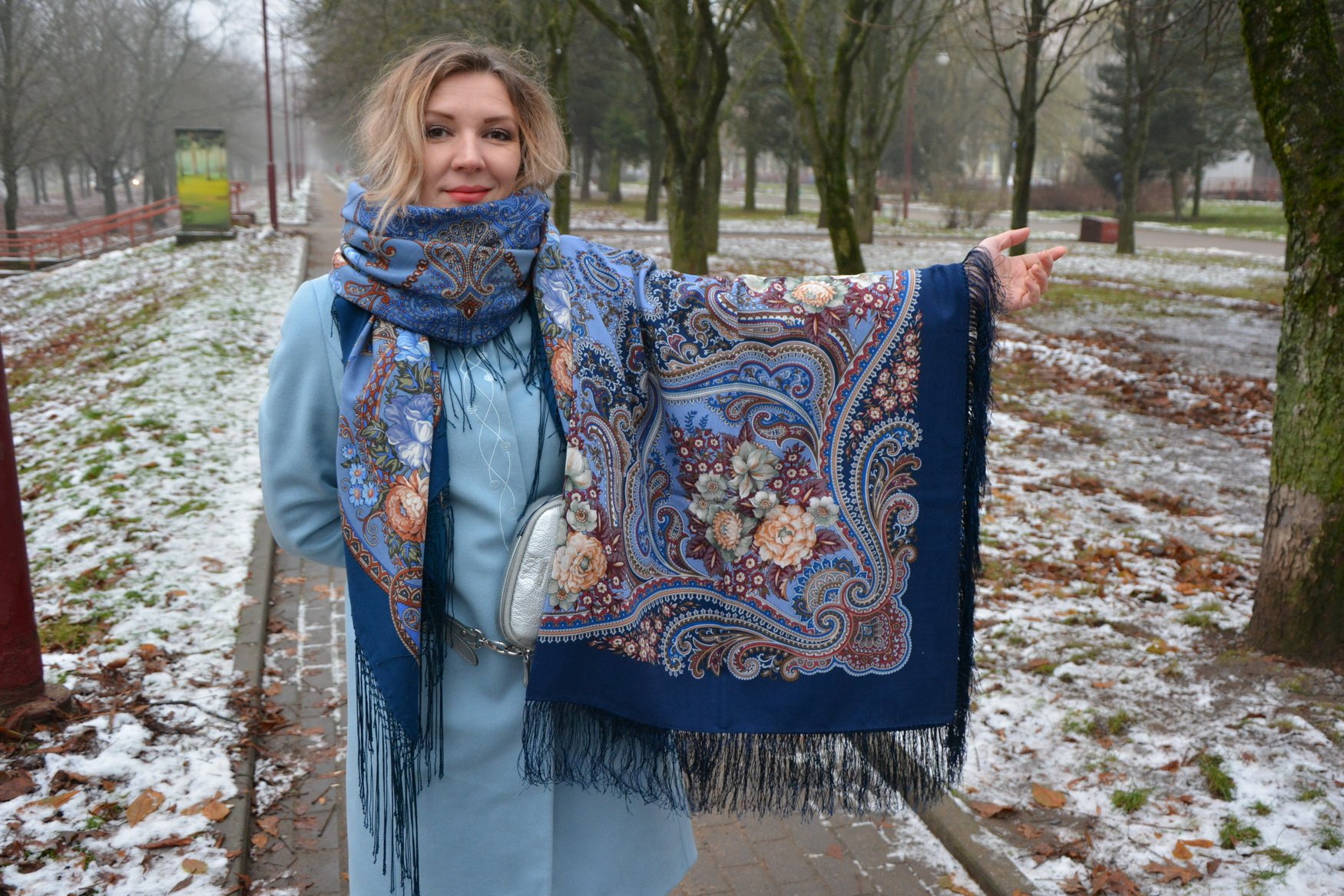 Все три платка заказаны не для меня: я лишь позволила себе примерить и сравнить. На улице холодно, пасмурно, туман и жуткий ветер, поэтому не до красивых намоток.