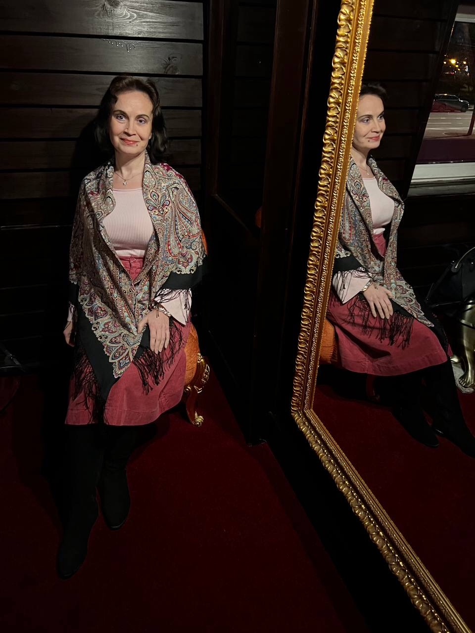 Здравствуйте Осень -Ольга ^% ^% ^% , спасибо что заглянули в тему и оживили ее . С удовольствием разглядываю Вашу фотографию, хочется рассмотреть весь образ в деталях. Платок красиво лег по спине. Элегантный образ.