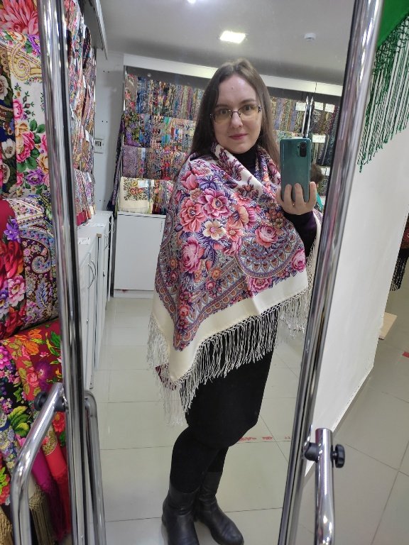 На фото стандарт, на котором пятнами присутствуют самые разные оттенки красного. Вот те куски шали, которые самые темные, мне очень нравятся и идут. Заказала на ВБ 1 сорт - пришел равномерно светленький, не впечатлил на мне.