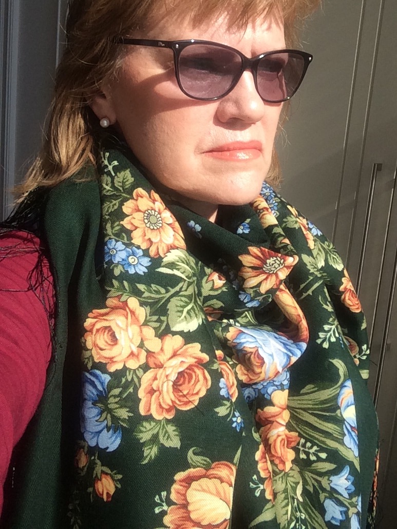 Крыжовник, отлично Вам этот платочек. Первое фото изумительное, сияющая улыбка и сказочные цветы платочка