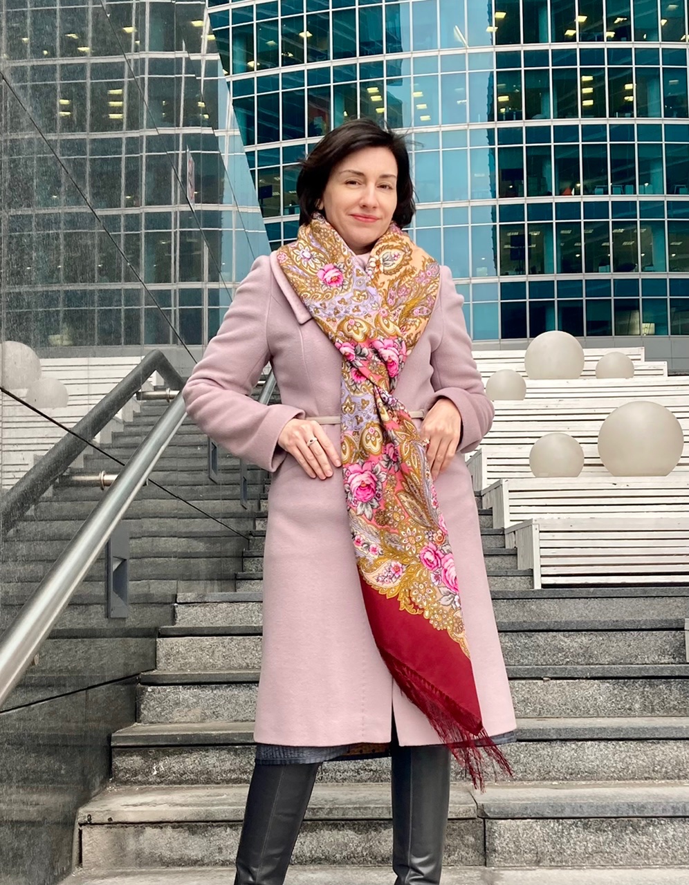 Вам очень идут "Павловские розы" в этом колорите, такой нежный платок, так подчеркивает вашу нежную красоту! Мне очень нравится ваш образ.