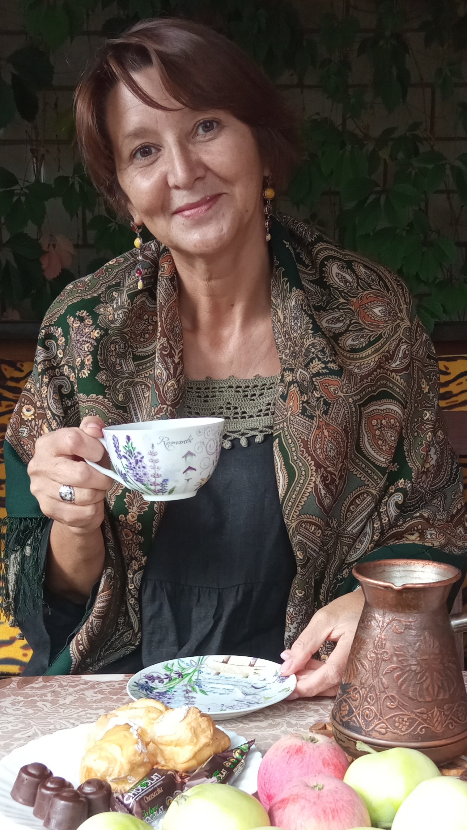 Да таких фото и не пару смотреть - наслаждение! Как вам идут шали, и как хороша Славянка! Эти ее букеты с земляничными листьями...ну не налюбоваться, я зимой Славянку ,если не ношу, достаю на кресло. И радуюсь. А носить..ну, так много с чем. С черным, с песочным...Кстати, лавандовое пальто оказалось невероятно дружественным почти ко всем моим шалям, прямо очередь к нему встала из платочков..