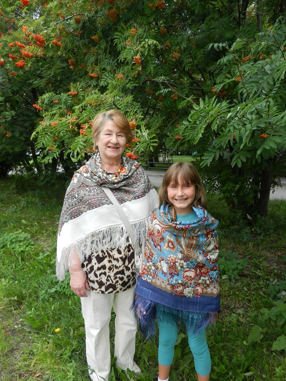 На прогулке две мои самые любимые дамы - внучка Варвара и мама. Младшую еле заставила слезть с самоката и постоять 1 минуту ( хоть и 8 лет, но шилопоп ещё тот).