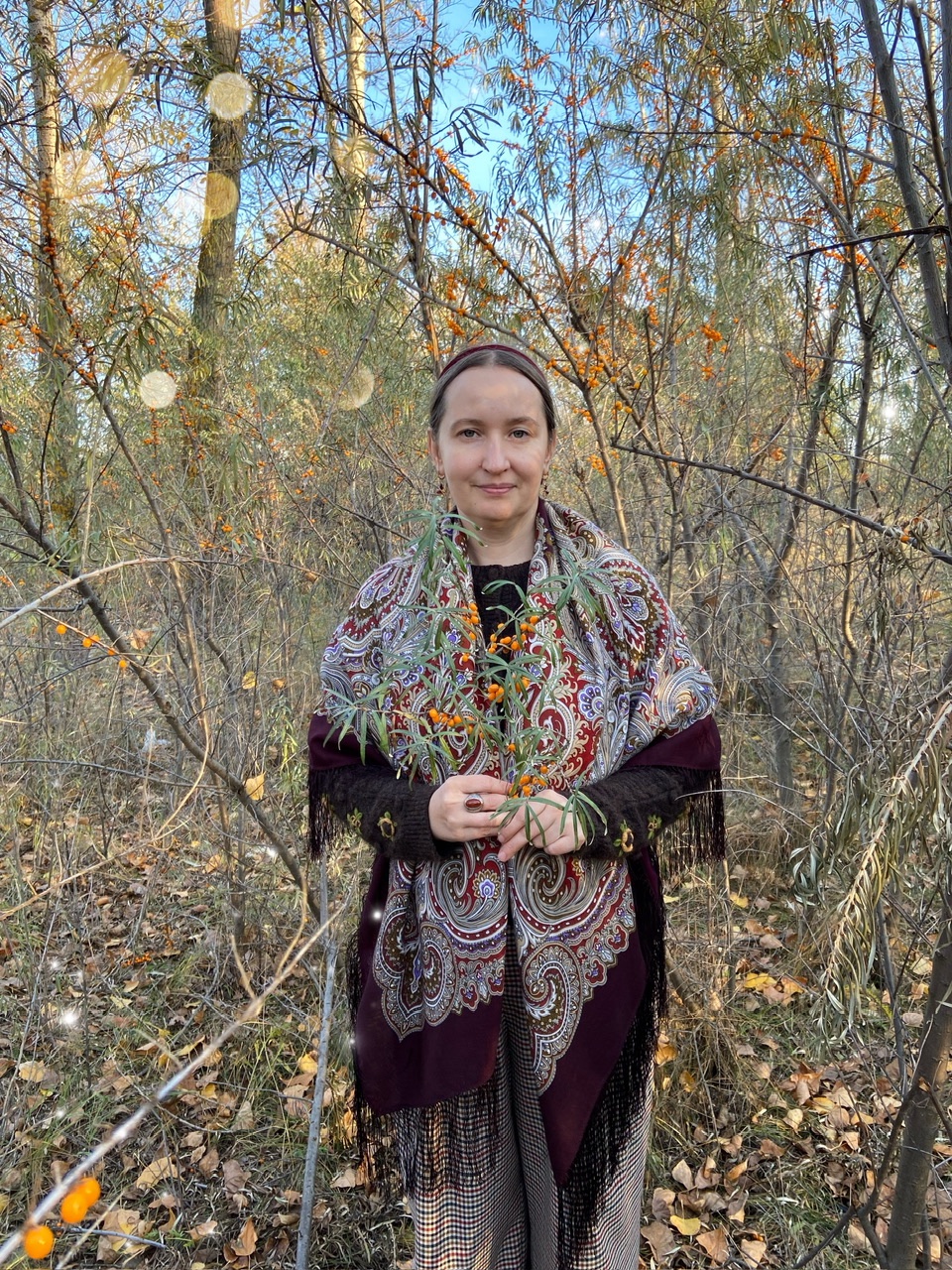 Елена,платок уникален,что подстраиваются под любой сезон,сейчас созвучен с опавшими листьями,голыми веточками,сухой травой!красивая осенняя прогулка!
