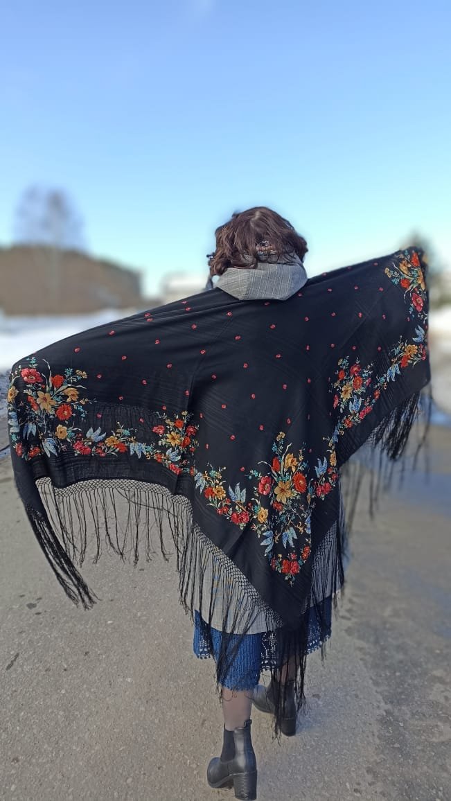 И она тебе превосходно. Как носить - по-моему, ты поняла (судя по последней фотографии, на дороге) - доминируют чистые цвета у лица (красный в частности), черный не доминирует. "Чёрное у лица нельзя" - это спорно (это про цветотипы и про то, с чем носить). И там, где шаль накинута поверх одежды, взгляд цепляется за цветы.