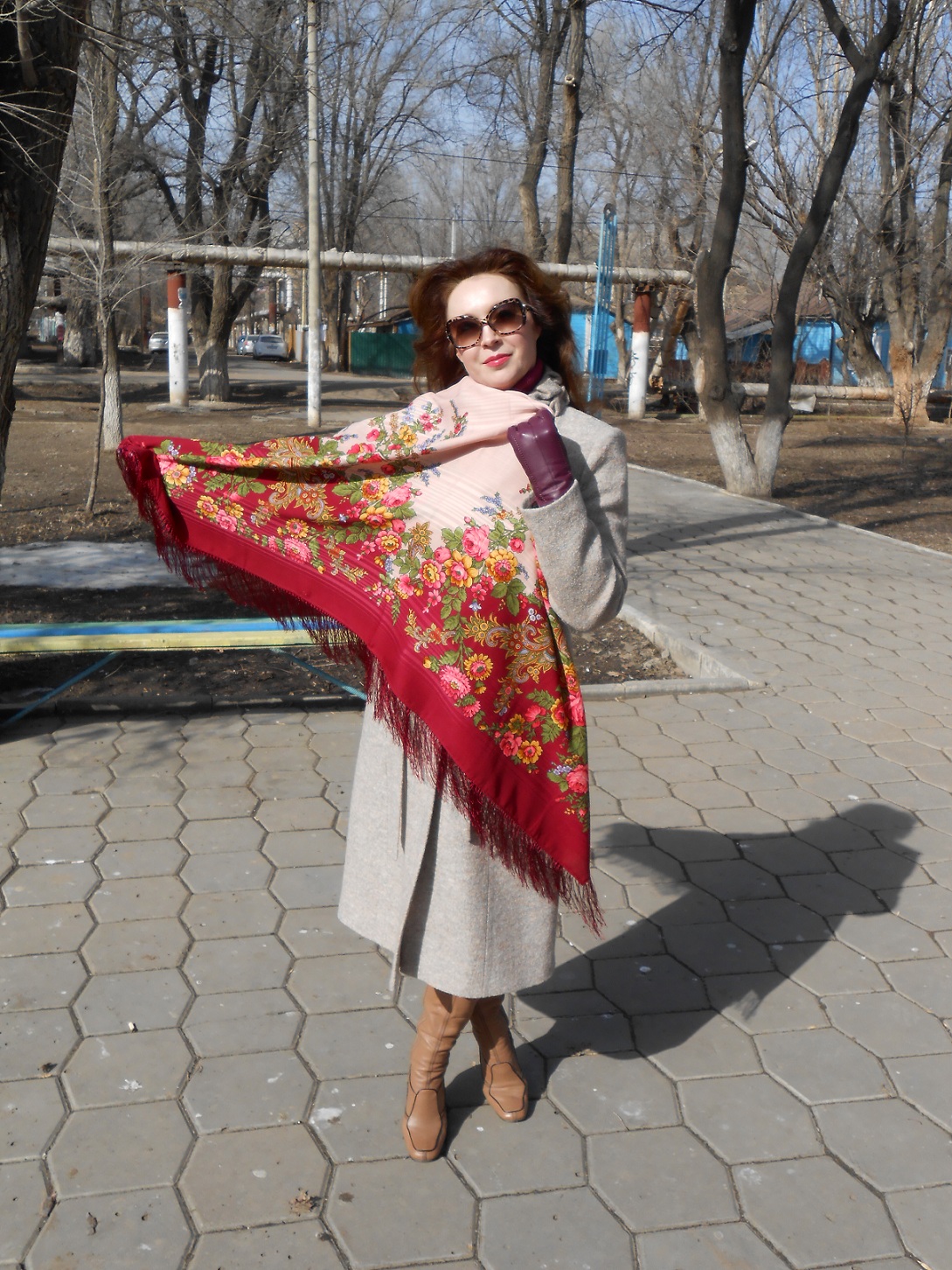 Платки не очень подошли по цвету, но это лучшие варианты из тех, что у меня есть. Интересно сочетание двух блестящих фактур. И - поздравляю с весной всех Форумчанок!