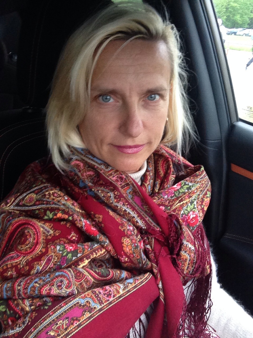 Алый цвет дарит такой заряд энергии.... На первой фотографии Вы улыбаетесь, и потому настроение от фотографии Масленичное! Нравится, очень! А можно уточнить: верно ли фотография передает основной цвет платка? Или искажает.... Я искала именно такой алый цвет