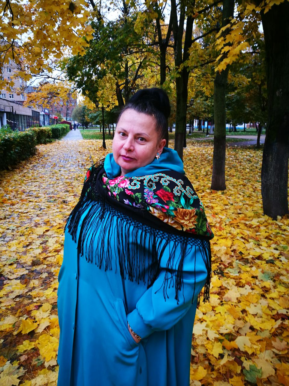 Ma-rusia, это восторг! Испанский лишила бахромы? Всё, это была последняя точка - пойду тоже бахрому дергать. Фото чудесные - красавица и осень. Черное пальто и стильный яркий платок - как это чудесно. Кайма расписная мне тоже на вас понравилась, но Испанский просто покорил.