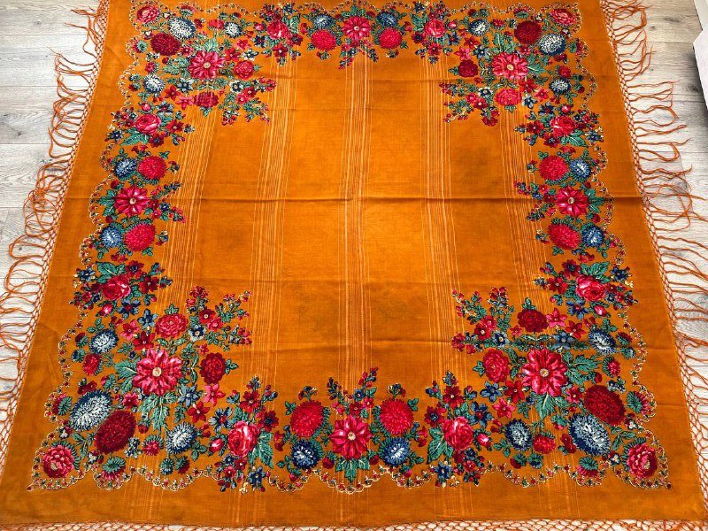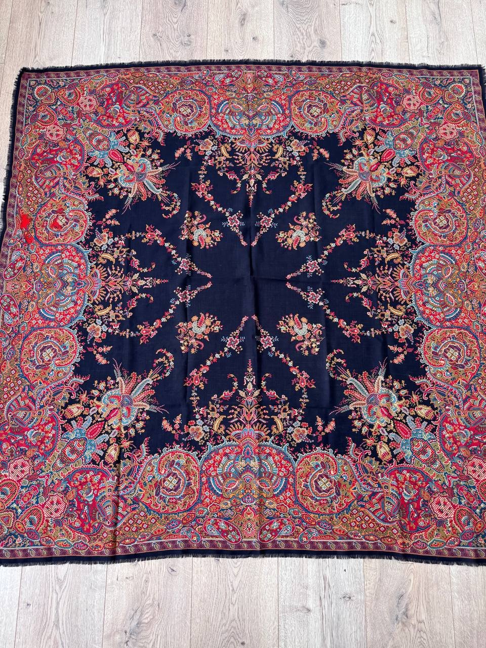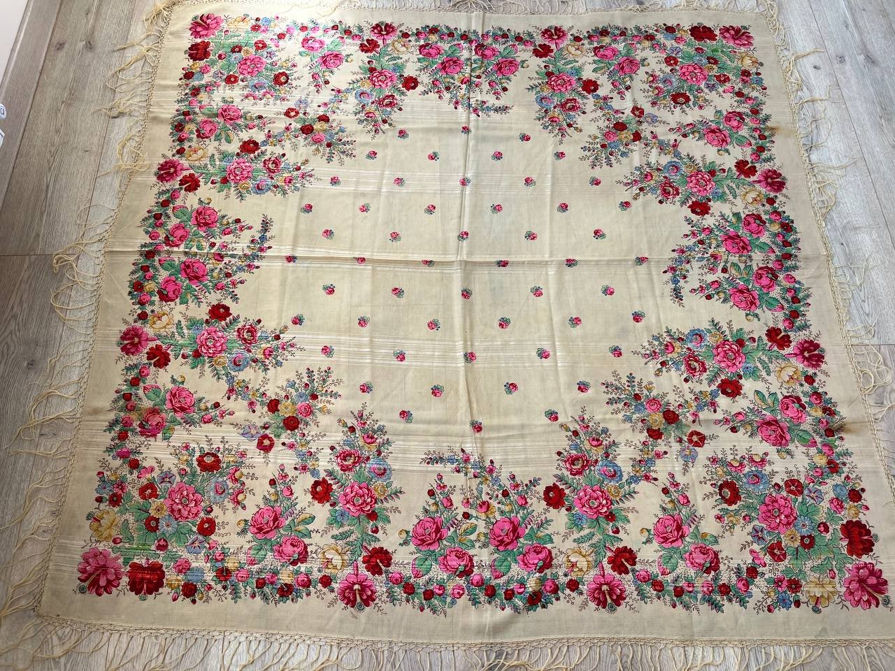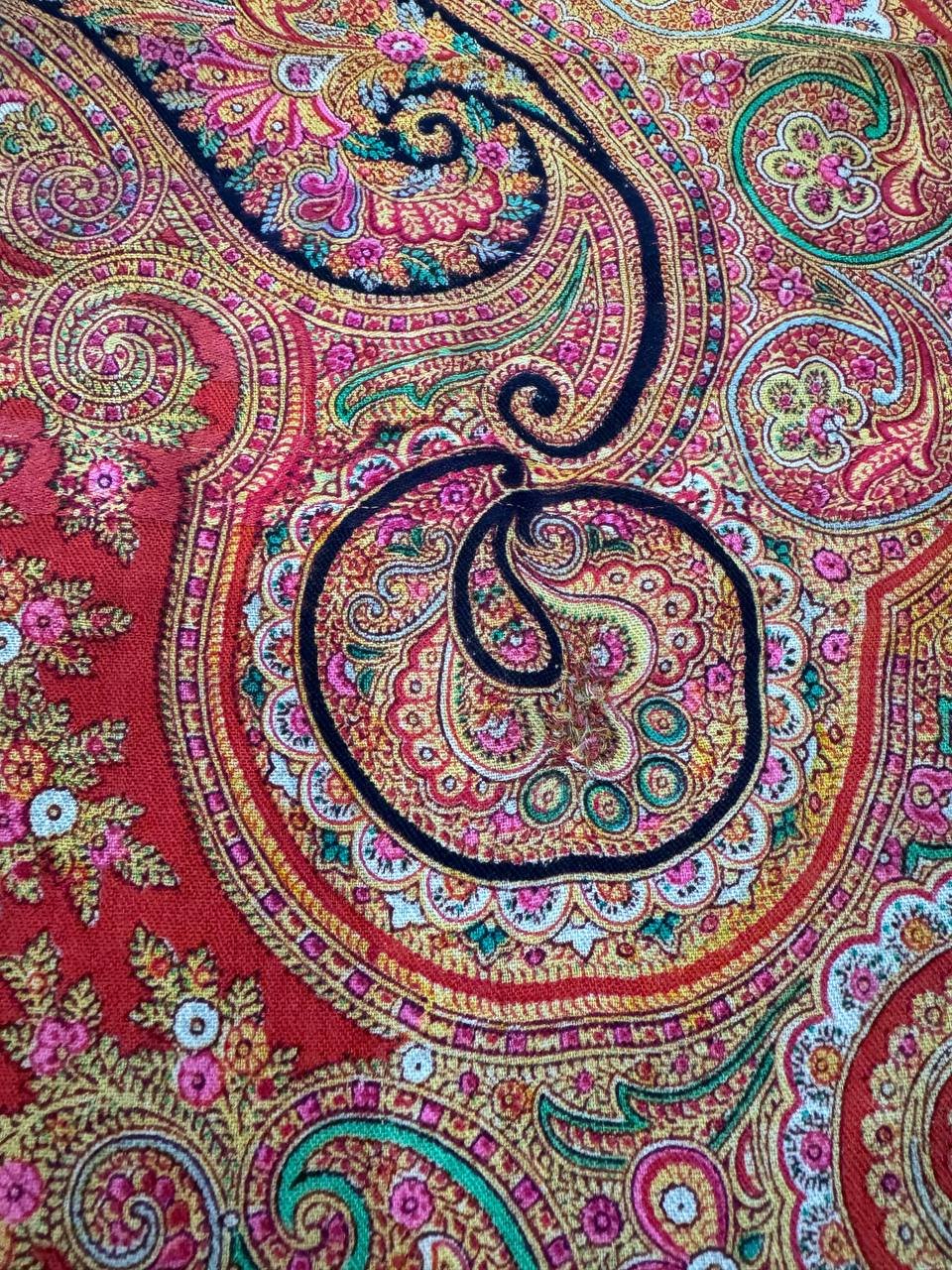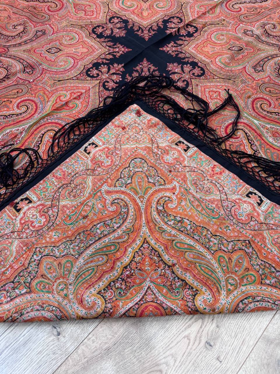 Описание продавца: Дореволюционная шаль с номерным штампом № 92 (конец XIX – начало XX вв.) Такие номера ставились на мануфактурах для учета партий или рисунков в каталогах, что является прямым подтверждением солидного возраста и фабричного происхождения изделия.