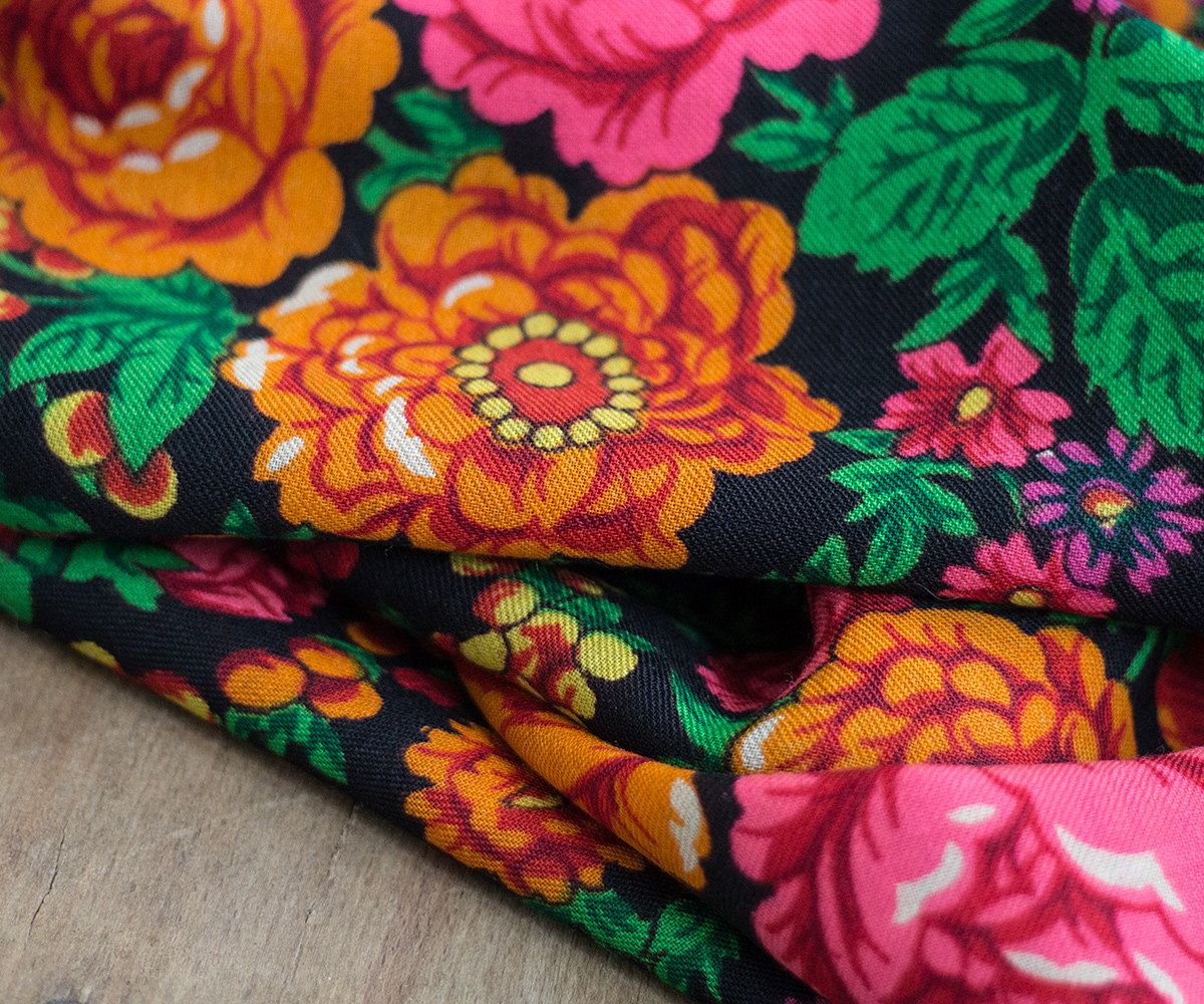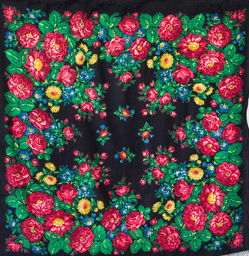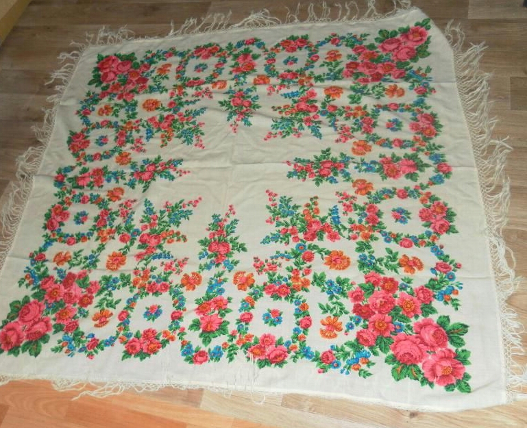 В 70-х гг. мало, кто носил большие шали, вот она и разрезала его на 4 части и раздарила на память племянницам и внучкам. Этикеток не сохранилось. Знаю только, что платок был куплен в Москве.