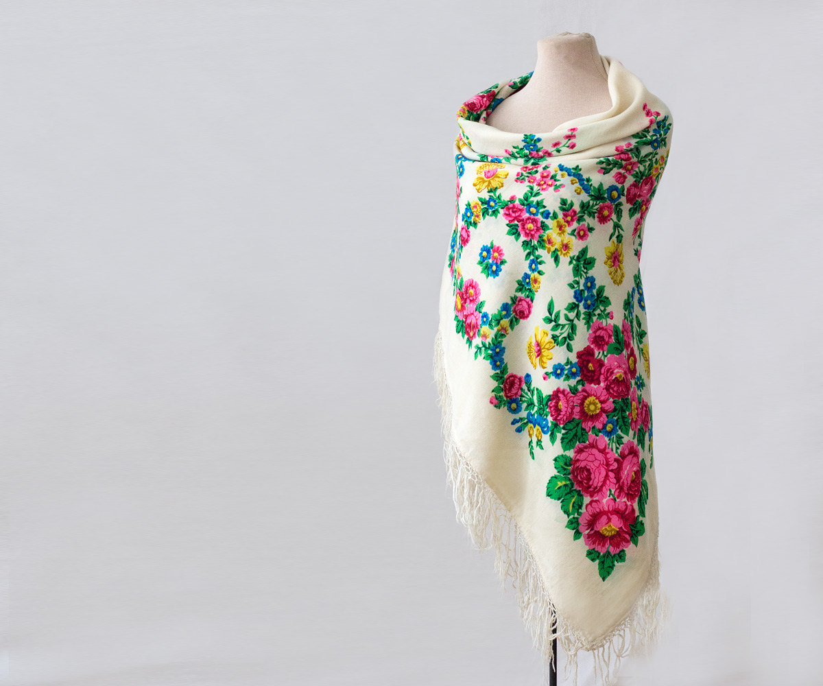 Шаль шерстяная 150х150 с гирляндой из веночков по кайме и букетиками_Галереи художников