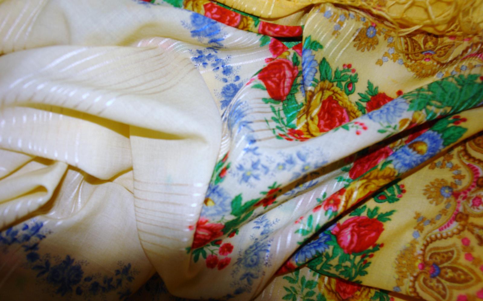 У этой шали кайма яркого жёлтого цвета. Цвет каймы на фотографии передан точно, а средник оказался немного светлее реального нежно-кремового