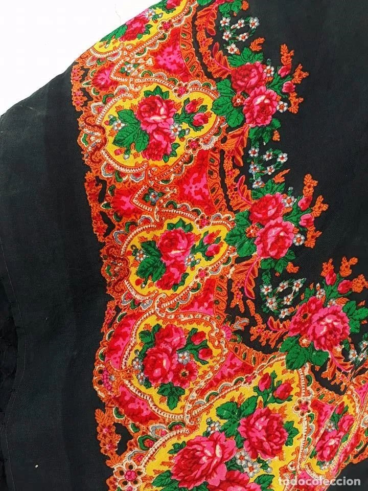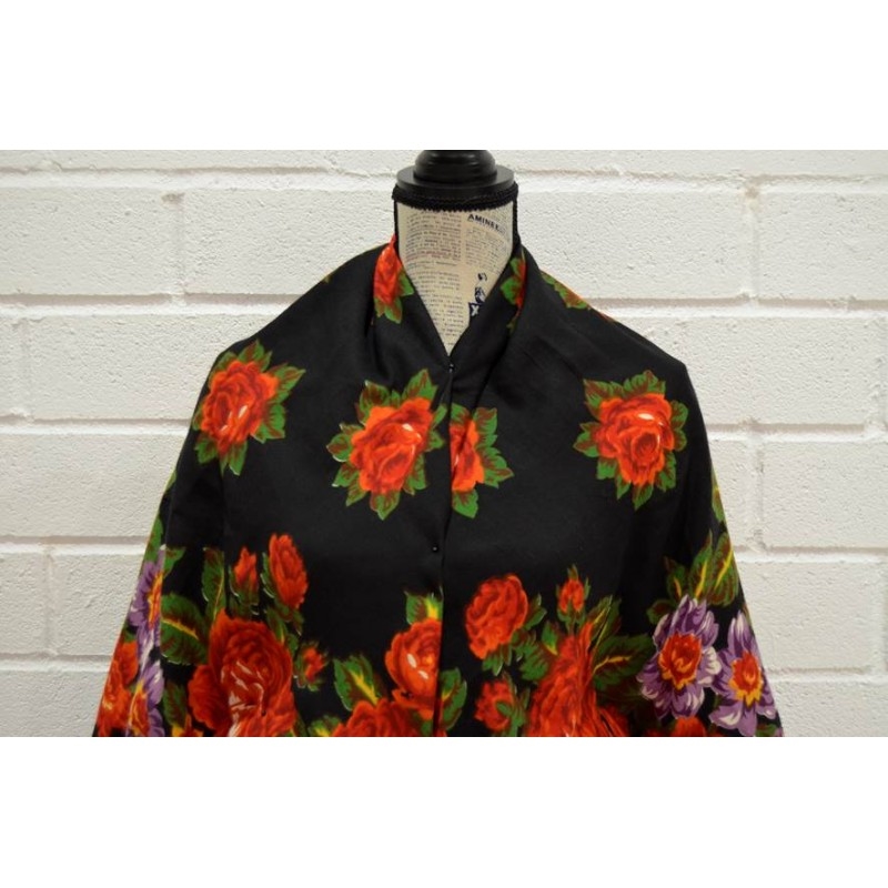 Старинная шерстяная шаль, набойка яркие цветы на черном фоне