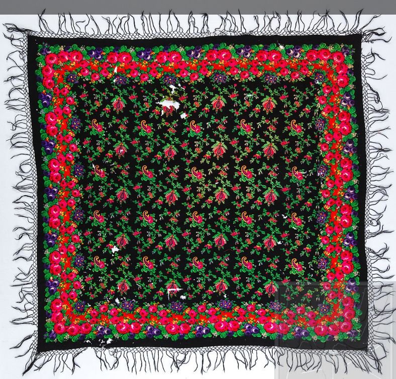 Платок кашемировый черный с набивным рисунком. По периметру цветочная рамка из полосы красных цветов с зелеными листьями и желто-коричневой ленты, в каждом углу цветочный букетик; средник без рисунка