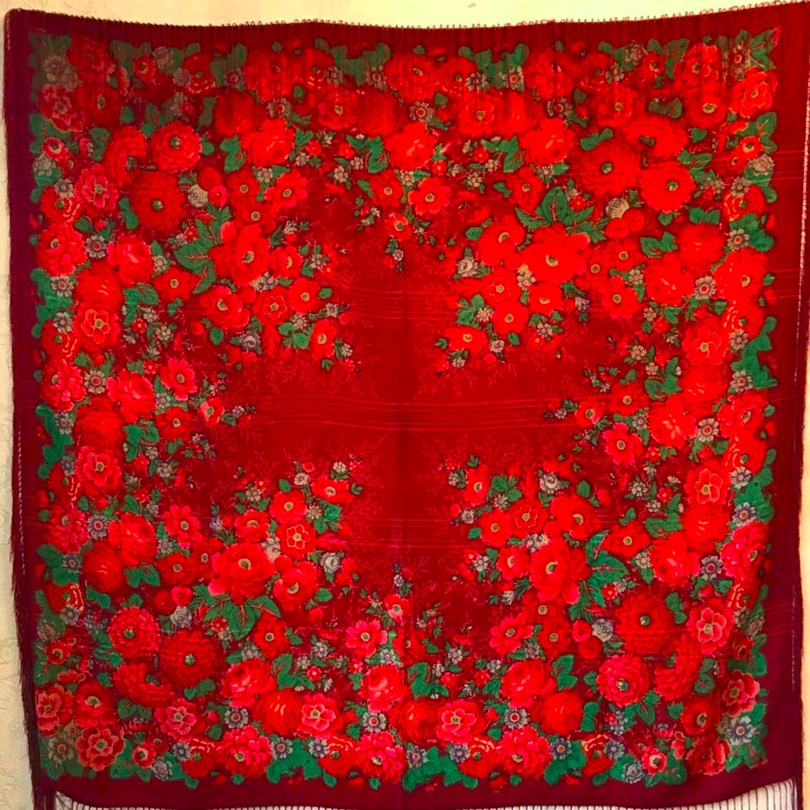Белой шерсти с красным, малиновым, зеленым, голубым, синим, желтым и сиреневым узором. В углах букеты из крупных роз с бутонами лилий с высокими тычинками, маков, пионов, веток с мелкими соцветиями листьев. Между букетами по сторонам небольшие букеты из тех же цветов, соединенные стелющимся стеблем из мелких маргариток. В среднике одиночные розочки, расположенные в шахматном порядке. по краю белая шерстяная бахрома.