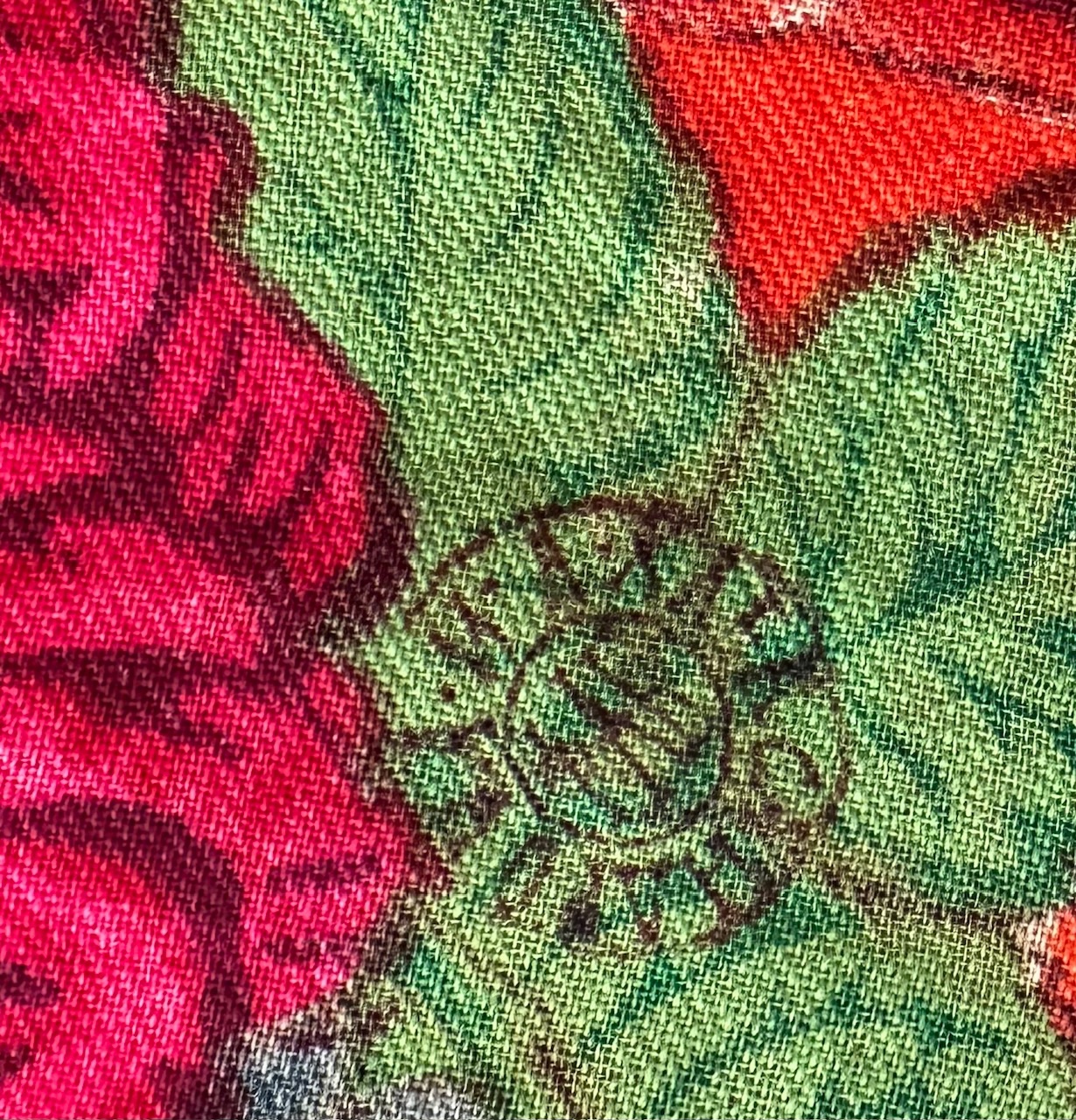 Шаль шерстяная, возможно смесовая. Размер 130 х 134 см. На оборотной стороне, в углу, клеймо Мануфактуры Александровых: в центре «ФАБ», вокруг «И. А. АЛЕКСАНДРОВА» А также цифра: 278.