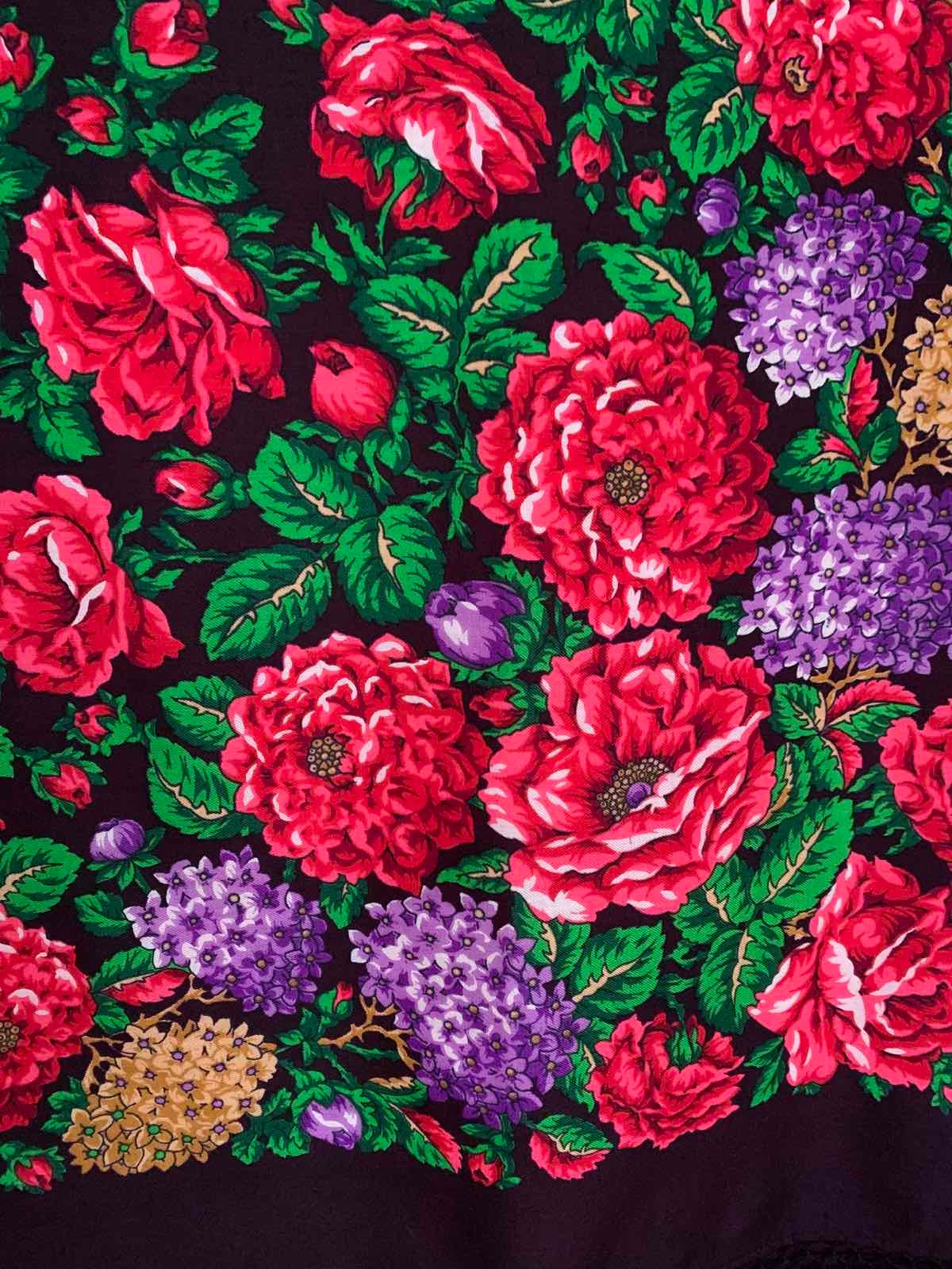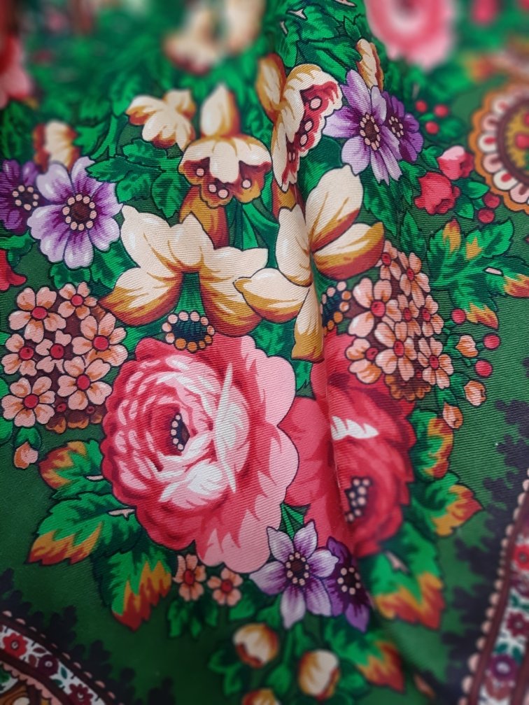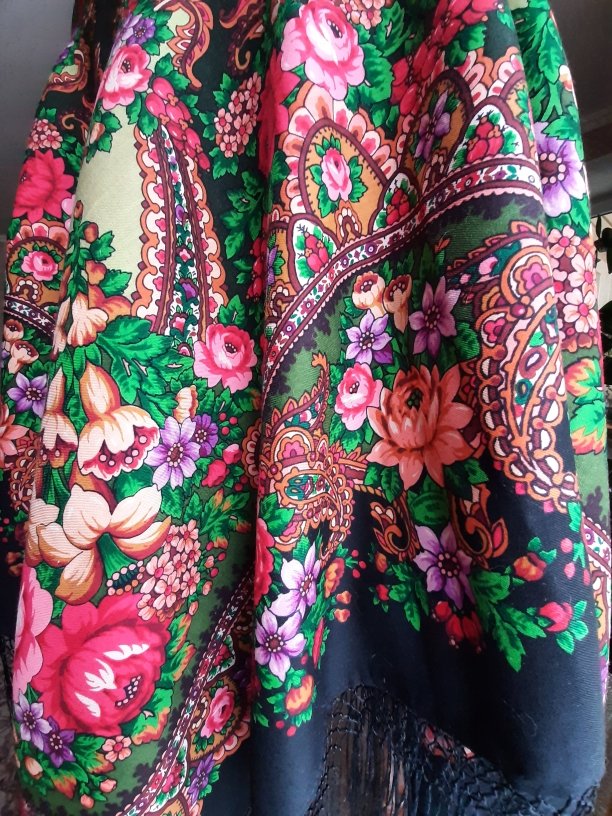 Шаль эффектная - роскошные цветы и выразительная сложная цветовая гамма рисунка. Попыталась с фотографировать, хотя цвет несколько засвечен, но так как шаль редкая выложу для сравнения.