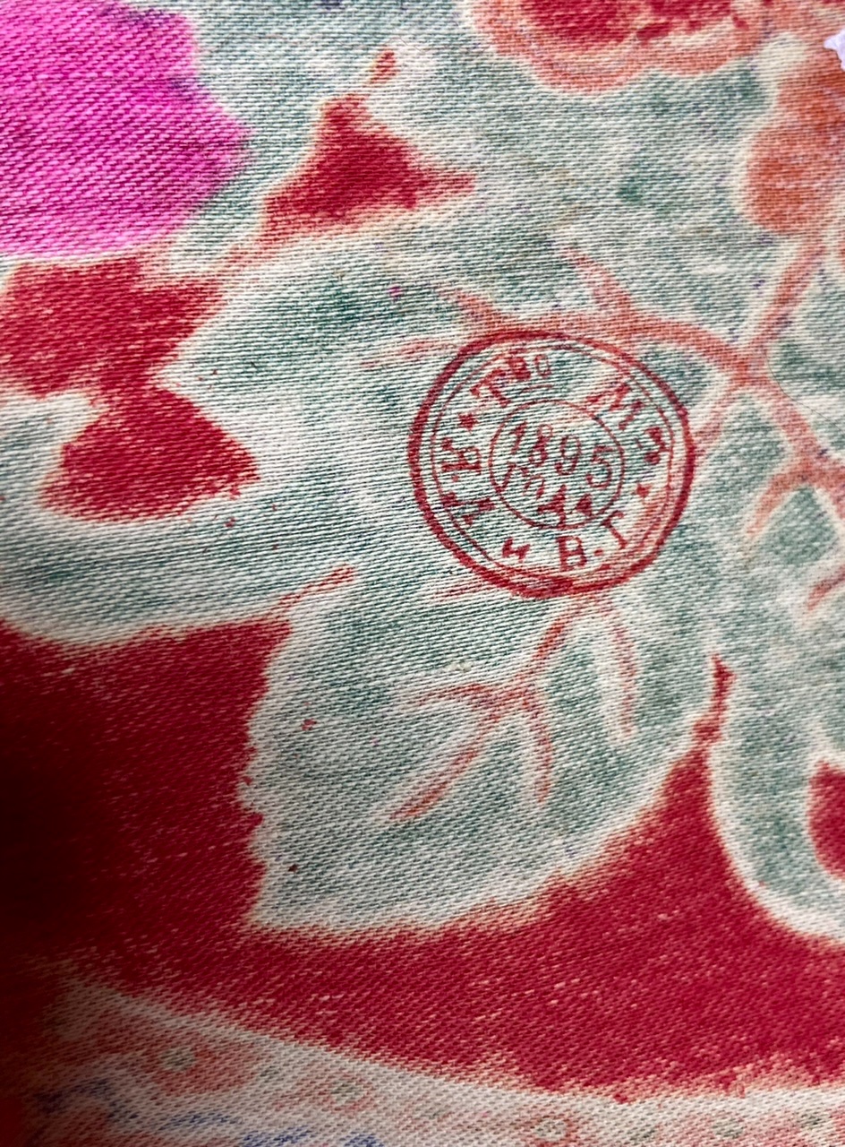 Контур напечатан разными цветами, в зависимости от рисунка. Использован для контура фиолетовый, вишнёвый, красный и чёрный. Какое же мастерство было у резчиков и набойщиков, ведь они работали с таким мелким рисунком!
