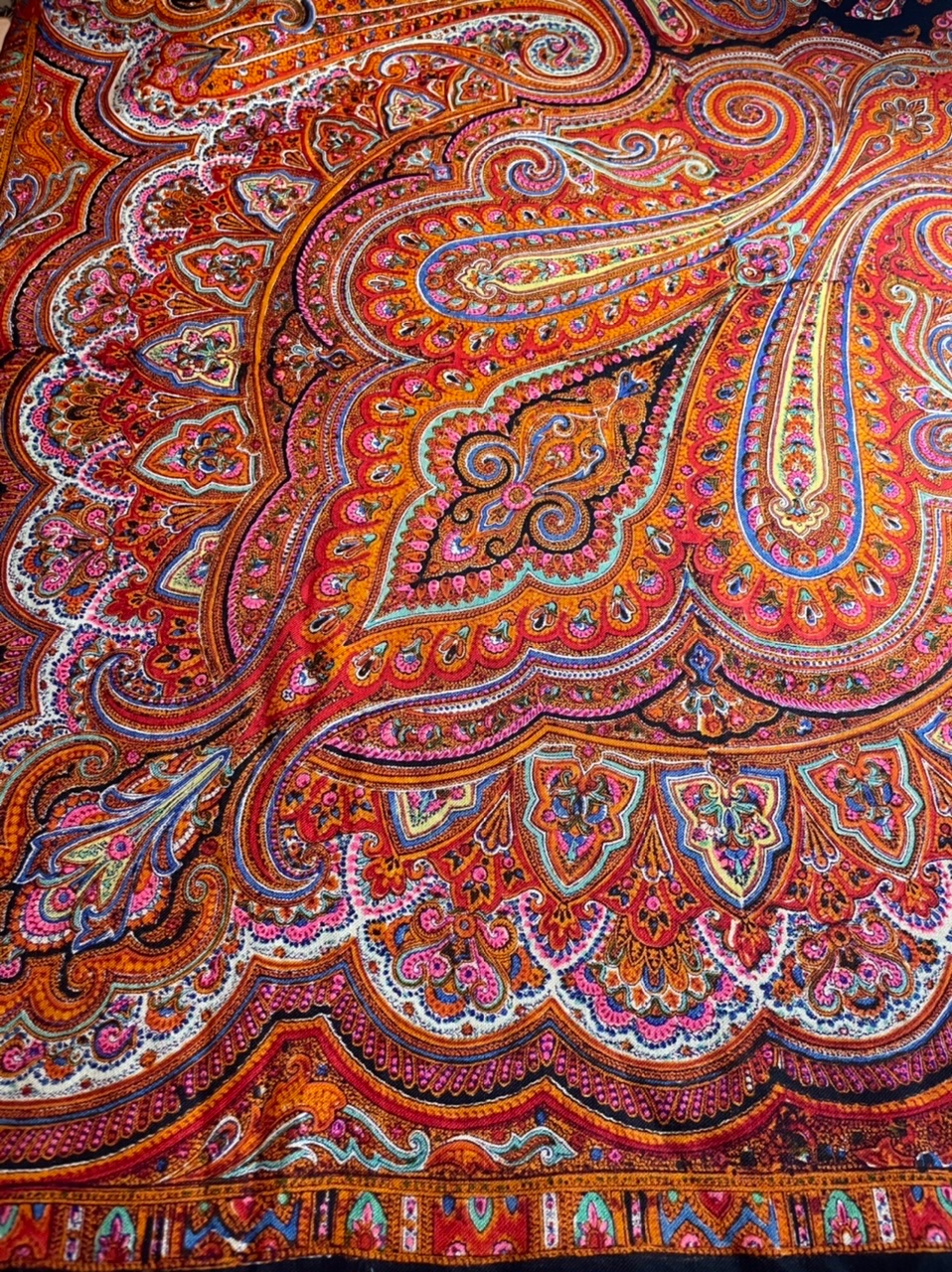 tata64, Татьяна, я не ожидала и от себя такой же реакции:)) восторгаюсь сложными рисунками с цветами и букетами, а когда вчера разложила на столе эту драгоценность, совсем растаяла. Орнаментальные шали абсолютно красивы! И какая точная набойка такого мелкого рисунка! Меня тут поразило неожиданное сочетание рыжего и розового.