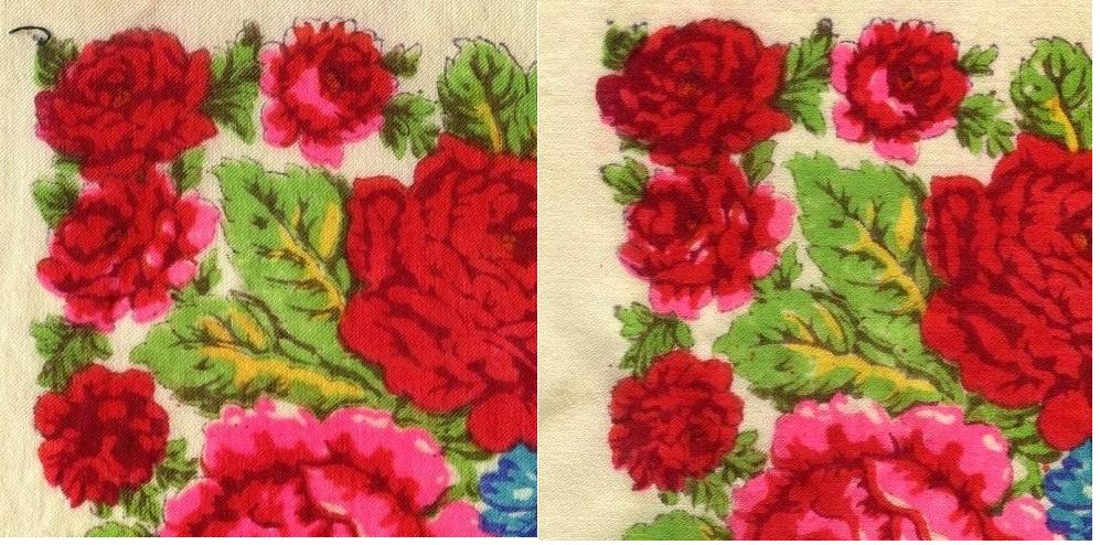 Все четыре угла разные! Кстати, различия в оттисках при ручной набойке и сдвиг шаблонов при фотофильмпечати дают совершенно разный визуальный эффект, чем и отличаются друг от друга. При определённой "насмотренности" ручную набойку несложно отличить от печати по шаблонам.