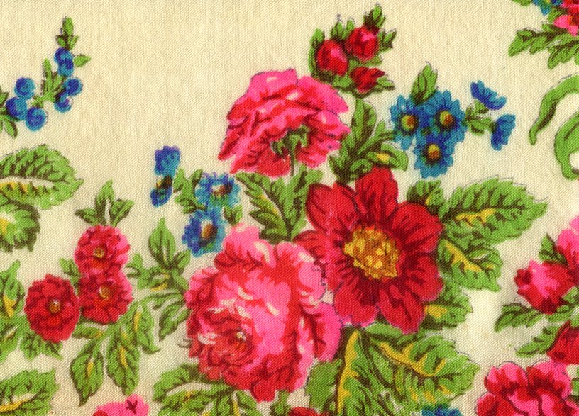 Итак, платок без названия, автор рисунка Евгения Штыхина. В музее ППМ есть фото такого же платочка, с указанием авторства, что и явилось источником "опознания" платочка. Спасибо еще раз нашим экскурсантам! Кроме того, на этикетке к музейному платочку указано, что он изготовлен в технике ручной набойки, и обозначена дата - 1971 год.
