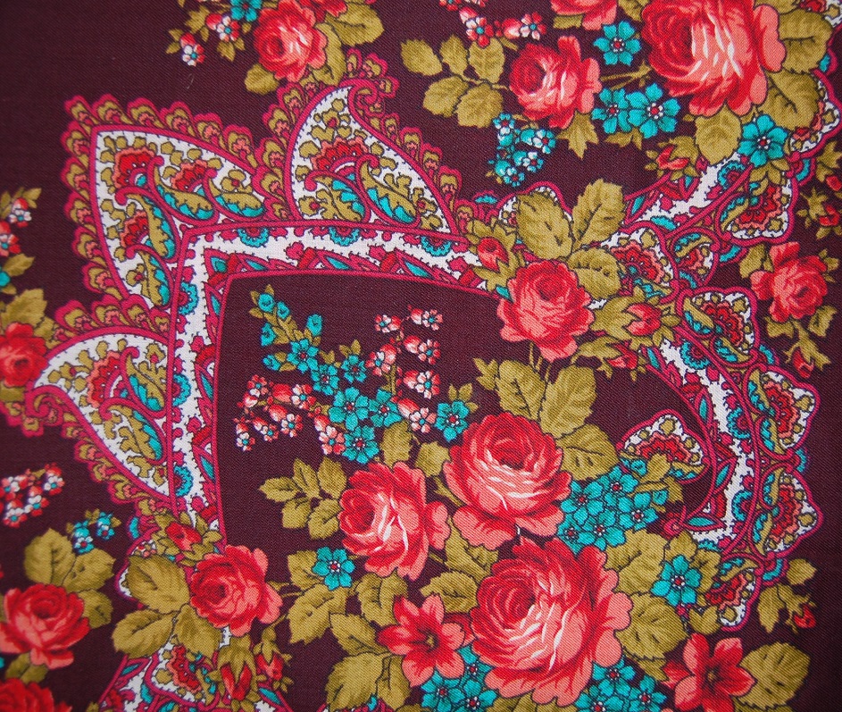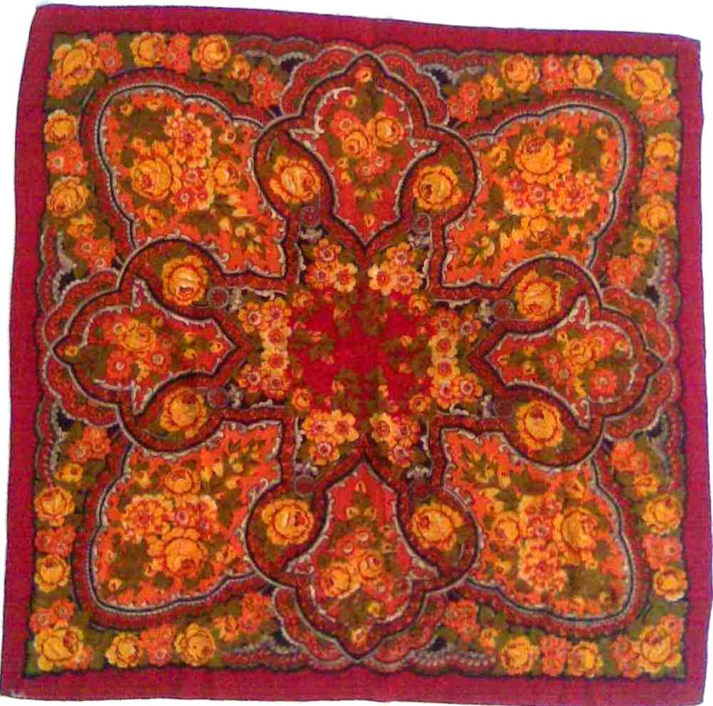 Платок маленький - стороной 88 см, даже не 89 см. На нём никаких опознавательных знаков. Этикетку я помню, была обычная белая, бумажная, вшитая в кайму оверлоком. На ней было написано, что это Павловопосадская фабрика. Ему лет столько, сколько мне, и куплен мамой для меня, и куплен он году в 1978 примерно. Может, и позже, но не позднее 1979 года. Был очень дорогим, несмотря на маленькие размеры. Когда я доросла до него, а было это, когда мне стукнуло 16 лет, то на второй же день я прожгла его на кухне: от спички отлетела искра. На платке видны крошечные ожоги, размером с пылинку. Мама рассердилась и отняла его и спрятала туда, где он лежал шестнадцать лет. Затем, года в 23, опять я до него добралась, и тут мама была бессильна: я его закалывала при помощи янтарной брошки. От этого тоже остались три крошечные дырочки. Вот если бы не это, можно было бы сказать, что платок выглядит, как новый. При своей яркости цвета спокойные. И всего пять красок на нем. А эффект... Я убеждена, что он кисти Слащёвой. Я его сама для себя называю "Мини-Финифть". Не сочтите за самоуверенность, а вглядитесь в эти розы... ппу_109