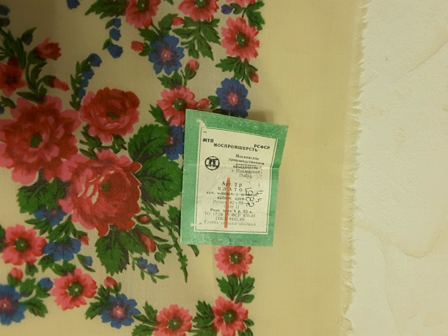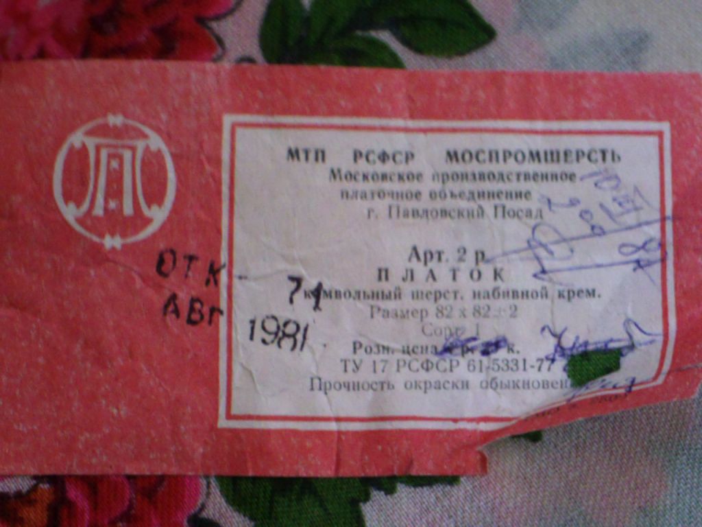 Платочек шерстяной 73х73 с простой цветочной рамкой_Этикетка МППО 1987