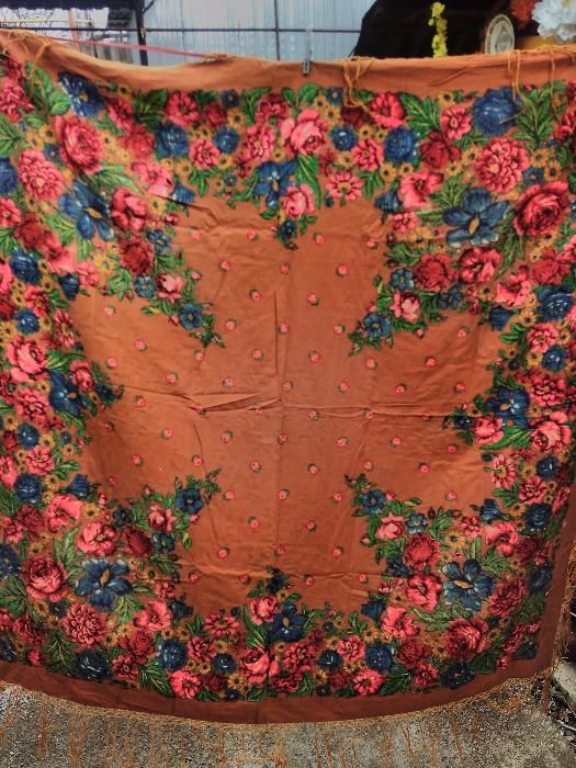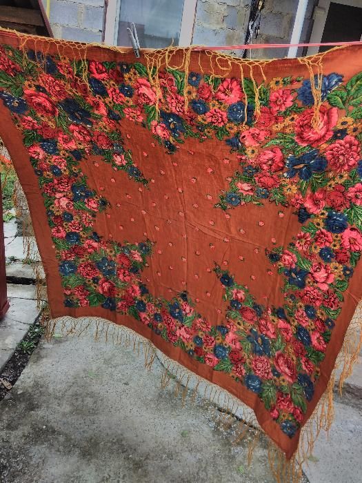 Платок ручной набойки. Размер 150х150 см. В нашем архиве есть аналогичные платки тоже ручной набойки, но более поздние, как мне кажется. И впечатление, что это - хлопковая шаль. Если ее купил кто-то с форума, напишите пожалуйста, на чем она напечатана.
