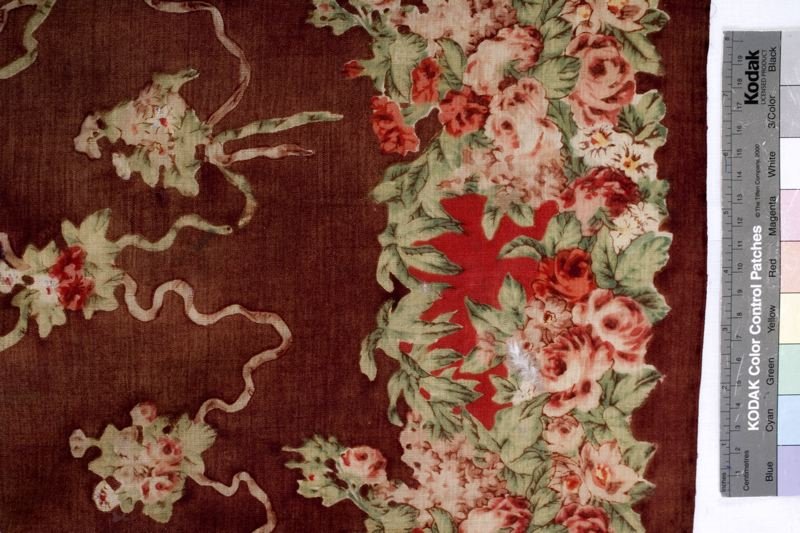 Шаль из полушерстяной саржи (хлопковая основа, шерстяной уток), с набивным рисунком из орнаментальной рамки и двух угловых букетов красного, зеленого, желтого и темно-коричневого цветов на желтовато-белом фоне.