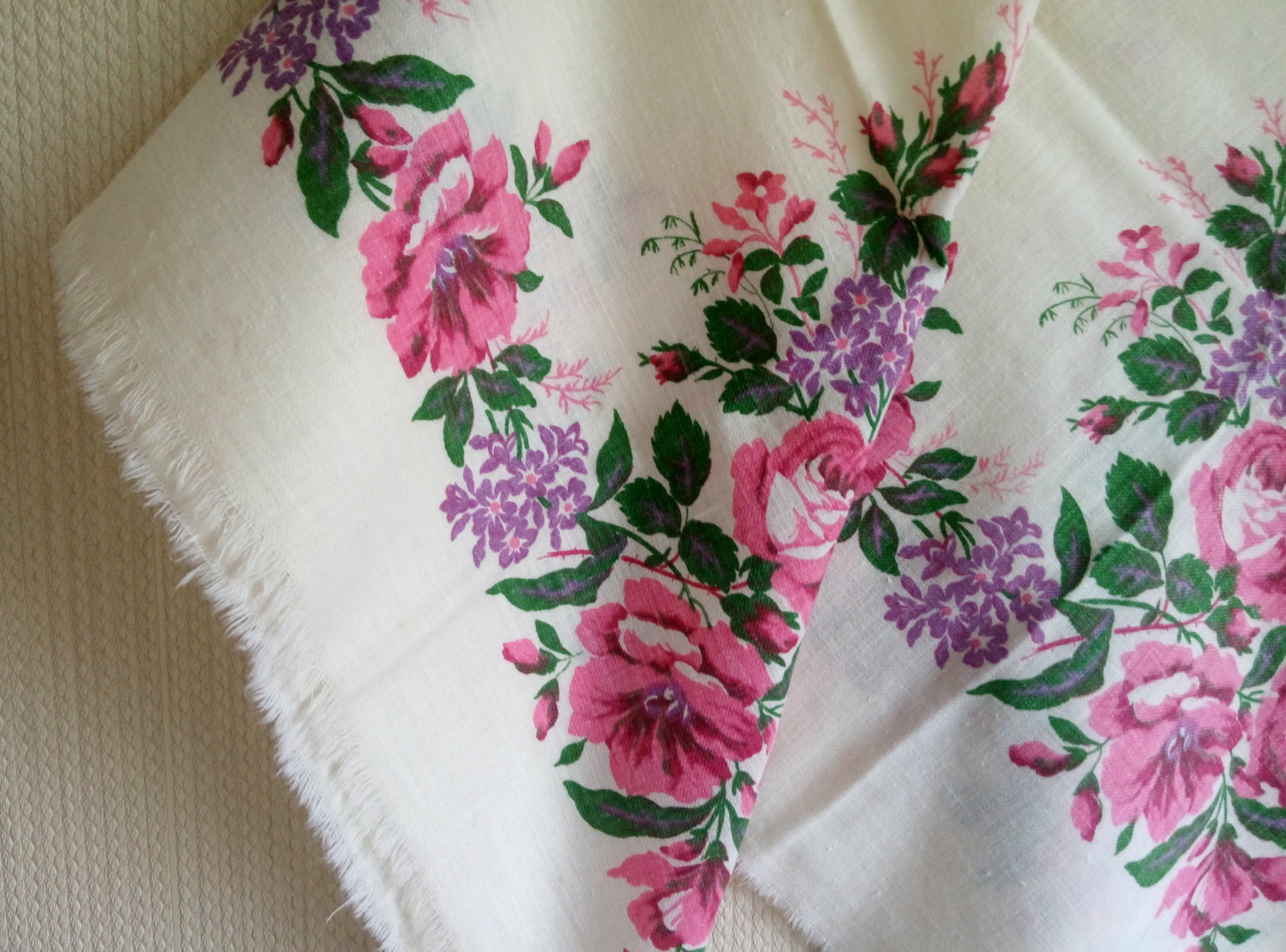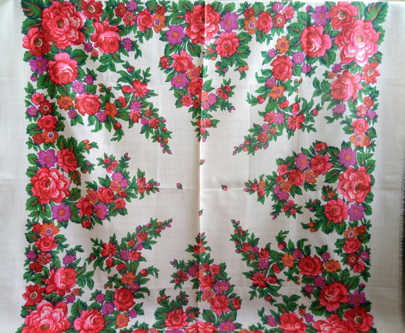 у меня такой же на хлопке, кремовый фон, с бахромой, 92х92 см.
