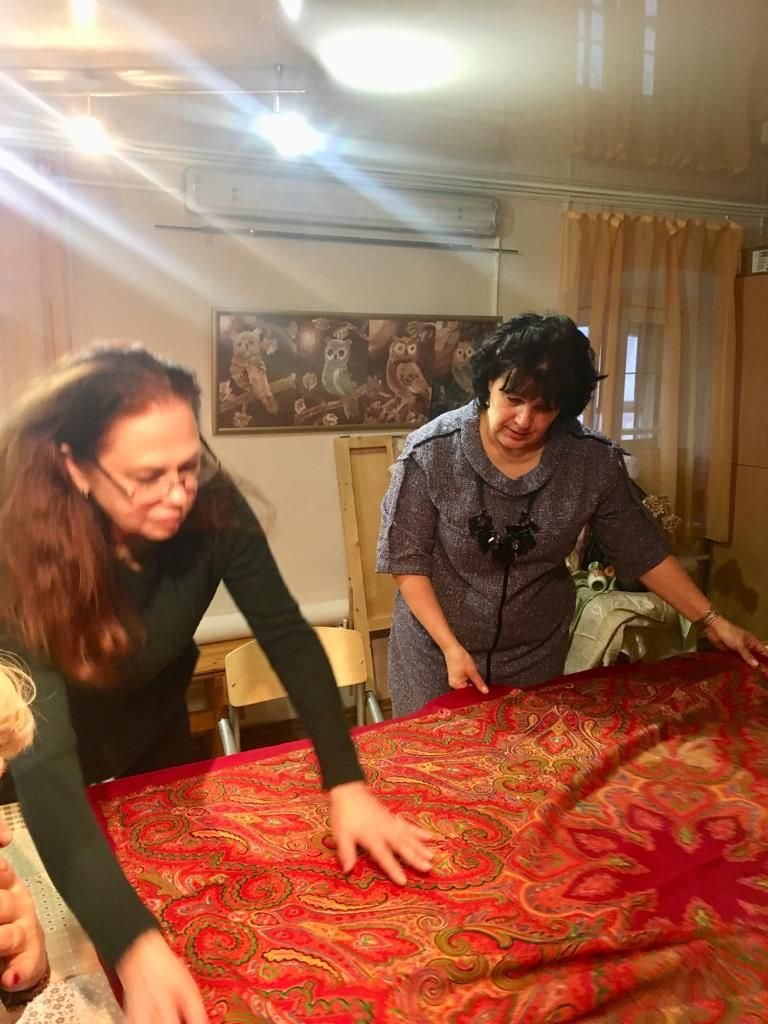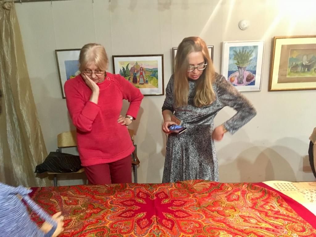 По уже сложившейся традиции взяла с собой несколько старинных шалей, появившихся у меня в прошлом году благодаря нашим украинским подругам. Среди привезённых оказалась шаль из коллекции восстановленных ППМ в конце 50-х гг. в технике ручной набойки старинных орнаментальных восточных узоров (таких, как уже известные "Золотой петушок", "Восточная птица" и другие)