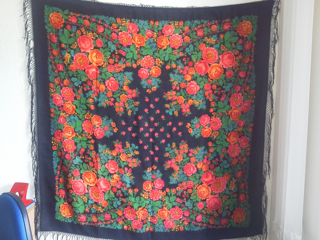 Обнаружила, что у нас совсем нет фото вот таких ПИОНОВ- 943 -(???). Точный колорит мне неизвестен, покупала их несколько лет назад, гораздо раньше, чем светло-сливочные 943-00, этикетка была старая, бумажная, полустертая. По аналогии с Цветущим Садом, платок мог бы быть 943- 02. На фото выглядит светлее, в реальности фон ближе к бежевому, как вареная сгущенка. Цветы яркие, веселые, с хорошим настроением