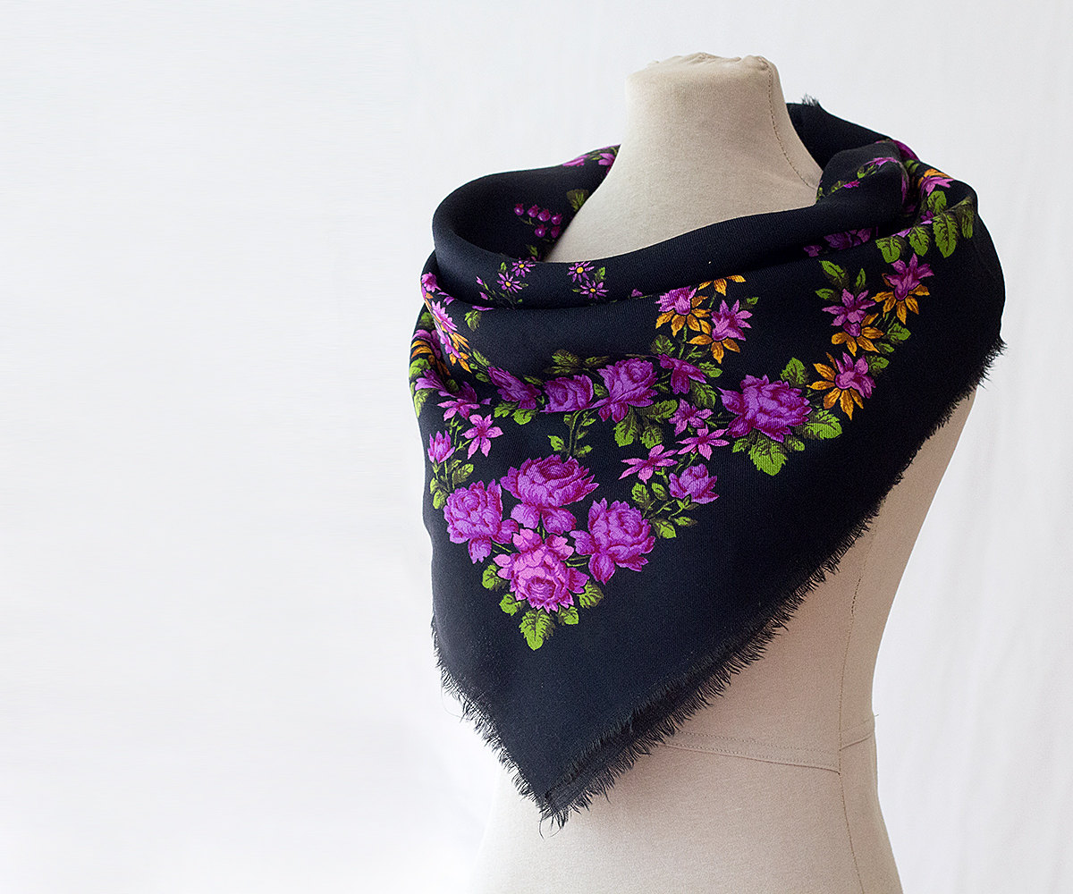 Платок шерстяной 82х82 с цветочным мотивом с розами, украшенным узкой декоративной лентой по кайме