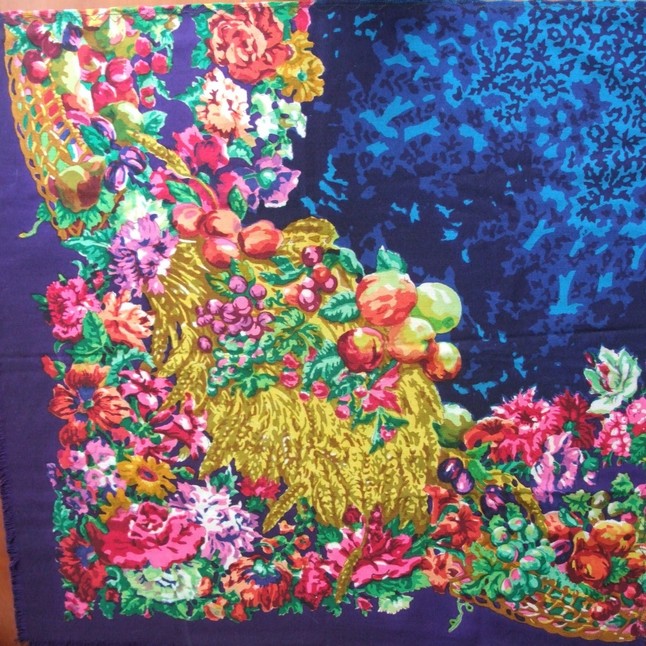 Скатерть шерстяная, квадратная, размером 150х150 см. Ткань имеет полотняное переплетение, шерсть плотная, из тех тканей о которых говорят, что они "держат форму". Рисунок очень красочный, набит вручную.