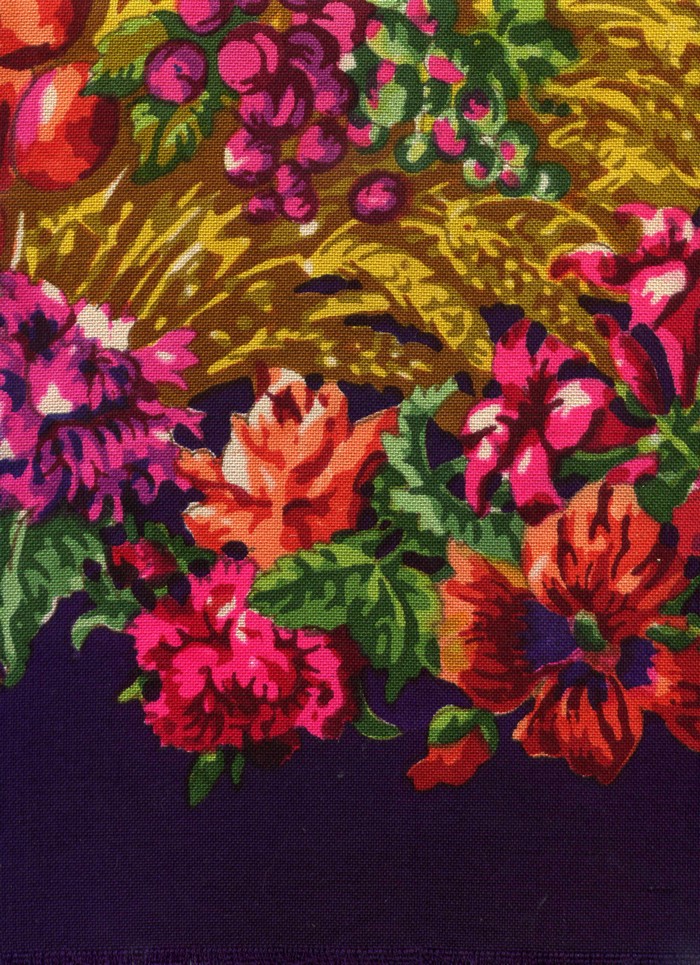 Рисунок построен по типу каймы, где содержимое одной корзины, расположенной по середине каждой стороны скатерти, плавно перетекает в другую корзину: цепочка снопов, фруктов, цветов, листьев. Груши (зеленые и рыжие), яблочки, сливы, вишни, виноград - чего там только нет! И цветы - в углах скатерти, и над корзинками - это гирлянда, обвивающая корзины. Вобщем - пир для глаз, рассматривать можно долго... и считать количество использованных красок.