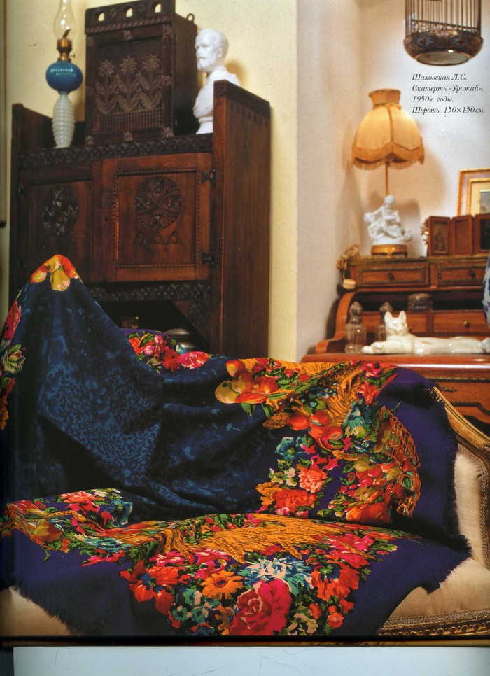 Я, конечно, видела фото скатерти "Урожай" и в предыдущей книге Н.В. Толстухиной и Т.А. Полосиновой "Павловопосадские шали", но там она не цепляла. И вдруг, первый раз листая альбом М. Колевой "Романс о павловопосадской шали", я вдруг обомлела от шикарного фото с этой скатертью. Только ради него купила себе эту книгу.