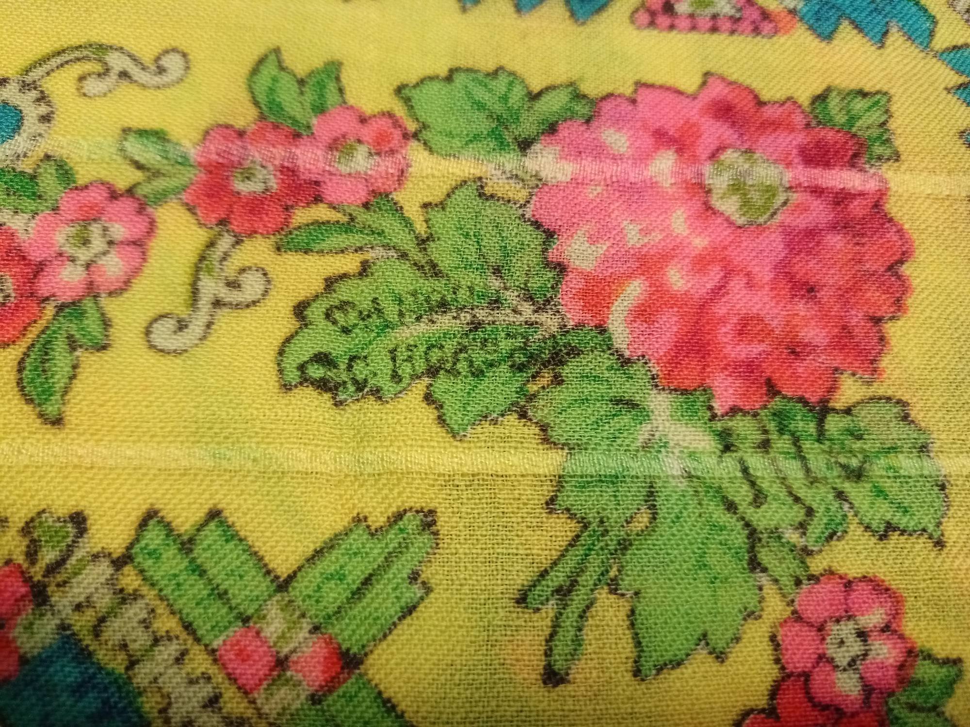 Старинный полушалок конца XIXв, ручная набойка, смесовая ткань (хлопок и шерсть), 110х110, кисти не сохранились. Клеймо овальное, 3,5х2,5 см, слабо читается.